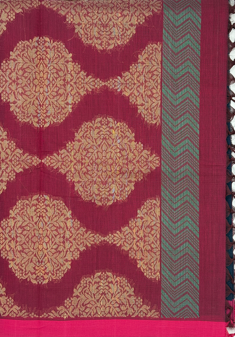 Drape yourself in understated grandeur with this luxurious **pure handloom cotton saree**, thoughtfully crafted to showcase timeless artistry. The rich amaranth body is beautifully enhanced with intricate orange and sandal colour thread designs woven all over, adding warmth, depth, and refined character. A bold contrast plain army green border frames the saree with elegant sophistication, creating a striking yet balanced visual appeal. Paired with a perfectly coordinated contrast army green blouse, this ensemble exudes classic charm and quiet luxury.