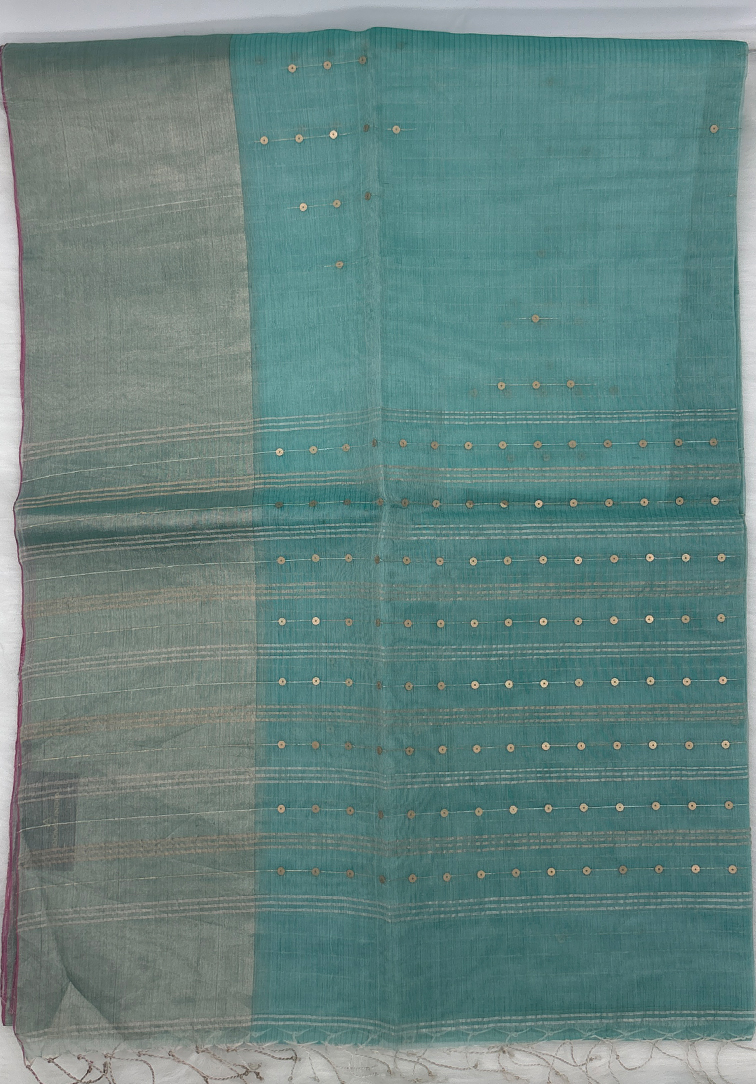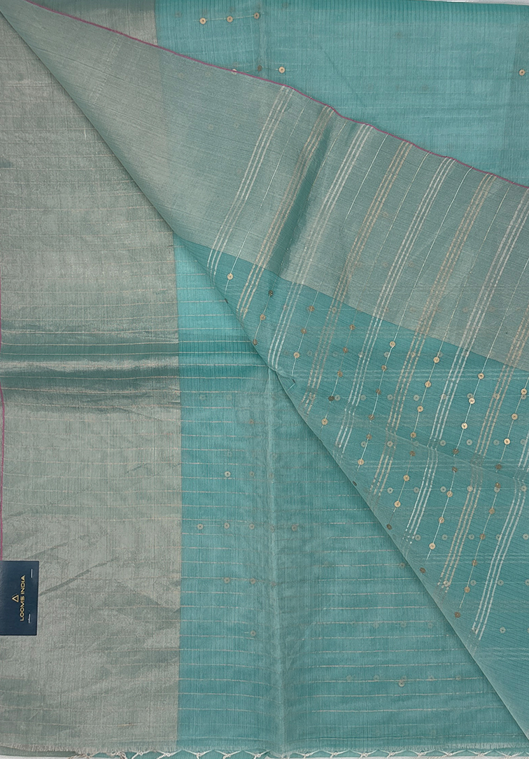 This graceful tissue Kora silk saree is woven in a soothing aqua blue tone that radiates freshness and refined elegance. The body features delicate all-over Gini work, adding a subtle sparkle and rich texture while beautifully complementing the lightweight, translucent nature of tissue Kora silk. The saree is finished with a plain dull silver Bavanji border, lending a muted metallic accent that frames the drape with understated sophistication. The minimal border enhances the saree’s contemporary appeal while maintaining its traditional charm. Paired with a self aqua blue blouse, the ensemble is perfectly coordinated. The blouse is detailed with all-over vertical silver zari lines, adding structure, shine, and a polished finish to the overall look. Ideal for festive occasions, elegant daytime events, and intimate celebrations, this tissue Kora silk saree is a timeless choice for those who appreciate subtle glamour and fine handloom craftsmanship.