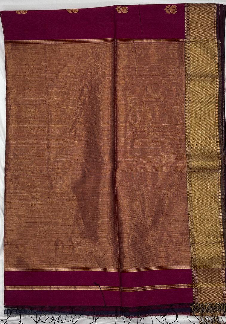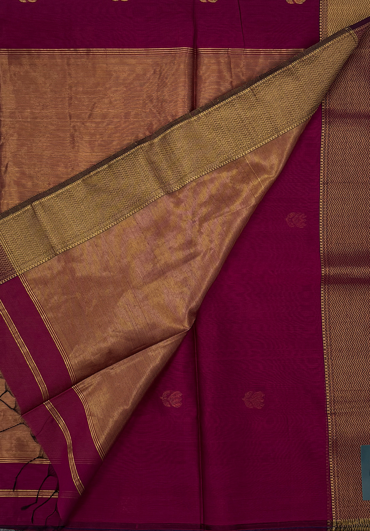 This exquisite Maheshwari handloom saree features a rich dark magenta body adorned with delicate golden lotus buttas, reflecting timeless elegance and traditional craftsmanship. True to Maheshwari heritage, the saree is crafted in a lightweight silk-cotton blend, offering a crisp drape, breathable comfort, and effortless grace. The contrasting beetroot-coloured border, highlighted with subtle zari work, adds depth and refinement to the design. Paired with a self-colour plain blouse finished with a coordinating zari border, this saree embodies the hallmark qualities of Maheshwari handloom—simplicity, durability, fine weaving, and understated luxury—making it perfect for festive celebrations, cultural gatherings, and elegant everyday wear.