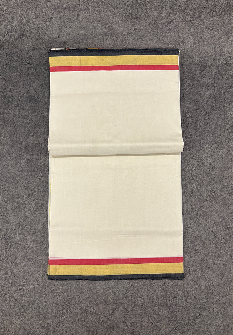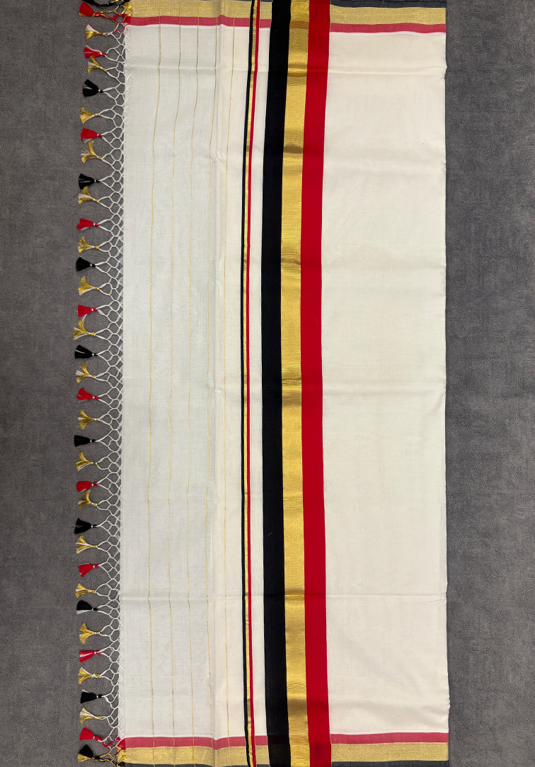 • Authentic Kerala handloom craftsmanship • Classic kasavu white body with bold tricolour border and pallu • Elegant black, red, and gold combination for a timeless appeal • Lightweight, breathable fabric for all-day comfort • Coordinated running blouse for a seamless look • Suitable for festivals, temple visits, Onam celebrations, and traditional events