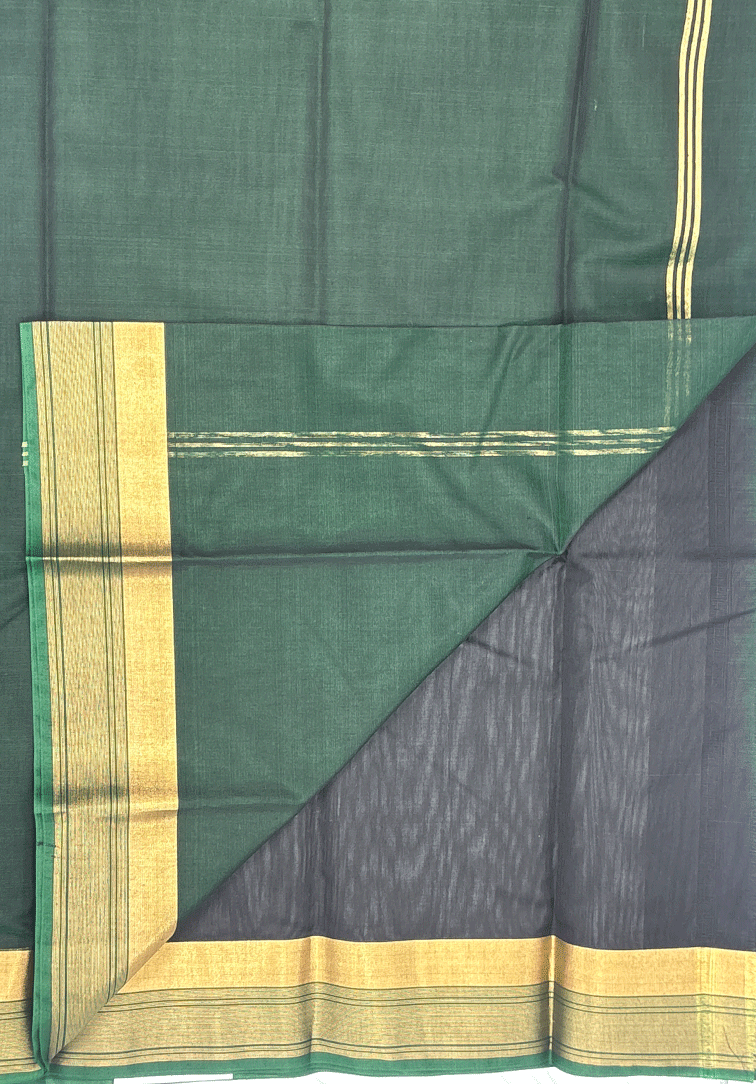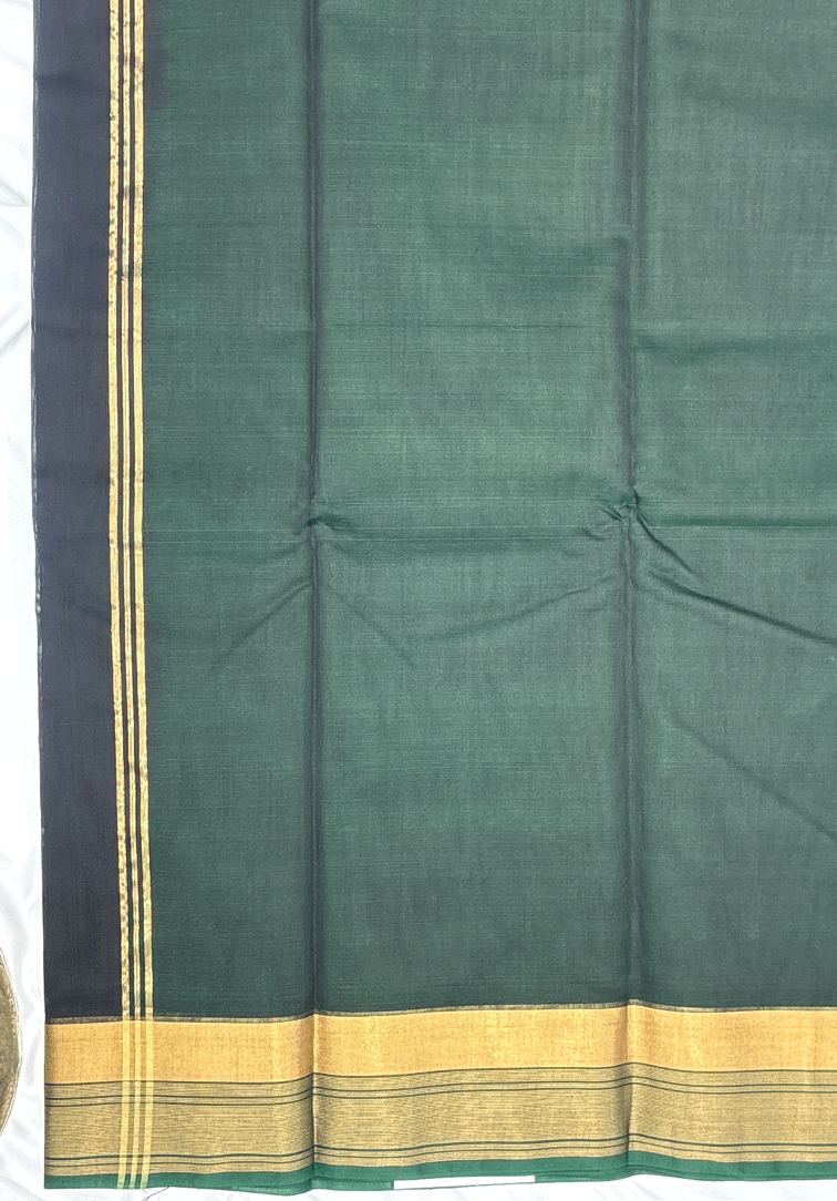 This classic pure handloom cotton silk saree features a striking plain black body that exudes timeless elegance and understated sophistication. The rich, deep tone of the body provides a perfect backdrop for the contrasting border, creating a bold yet graceful look. The saree is beautifully finished with a dark green border, intricately woven with elegant zari detailing that adds a touch of traditional richness and subtle shimmer. Complementing the saree is a matching dark green blouse, thoughtfully designed with a coordinated zari border to complete the ensemble with a polished and harmonious finish. Soft, breathable, and comfortable to drape, this handloom cotton silk saree is ideal for festive occasions, evening functions, and traditional celebrations. A versatile and elegant piece that reflects classic handloom craftsmanship with a contemporary appeal.