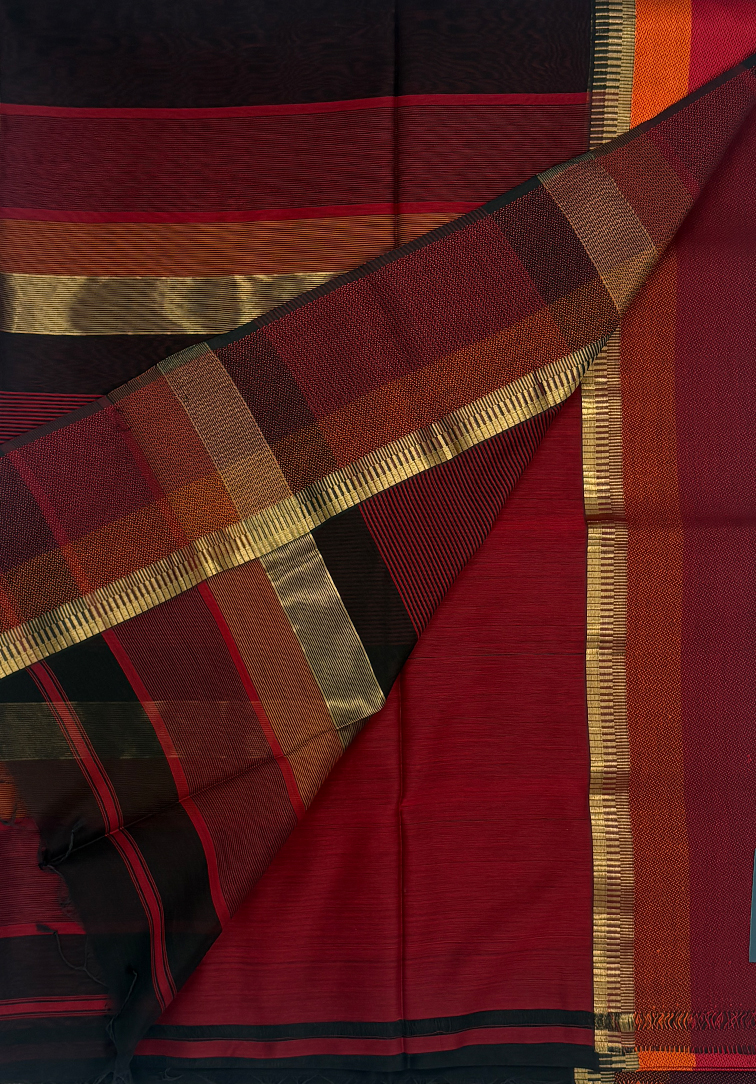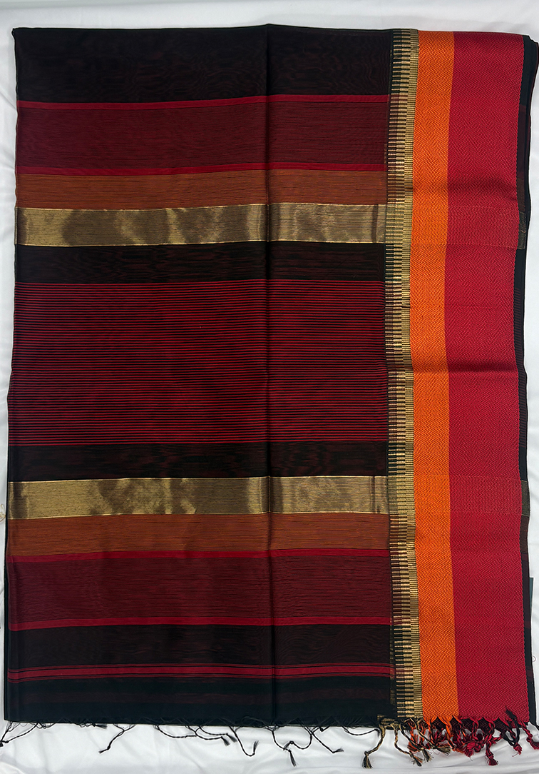 This elegant Maheshwari handloom saree features a classic black plain body that exudes timeless sophistication. The simplicity of the body is beautifully enhanced by a refined multi-colour thread border finished with a subtle zari accent, adding just the right touch of vibrance while maintaining understated elegance. True to Maheshwari craftsmanship, the saree is lightweight, breathable, and offers a crisp drape, making it comfortable for extended wear. Paired with a contrast maroon blouse detailed with a coordinated border, this saree reflects the hallmark qualities of authentic Maheshwari handloom—fine weaving, durability, effortless grace, and a perfect balance of silk sheen with cotton comfort. Ideal for festive occasions, formal gatherings, and refined everyday dressing, it is a timeless addition to any wardrobe.