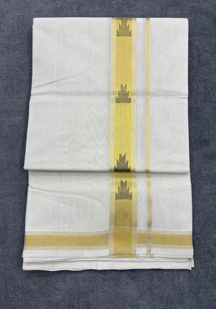 PURE UNAKUPAVU BALARAMAPURAM, KERALA HANDLOOM KASAVU mundu Pure handloom Kasavu mundu crafted in a classic off-white base, highlighted with a striking black temple design border that adds a bold and traditional contrast. Woven with fine cotton and finished with elegant kasavu detailing, this mundu reflects authentic Kerala handloom craftsmanship, making it ideal for temple wear, festive occasions, and traditional ceremonies.