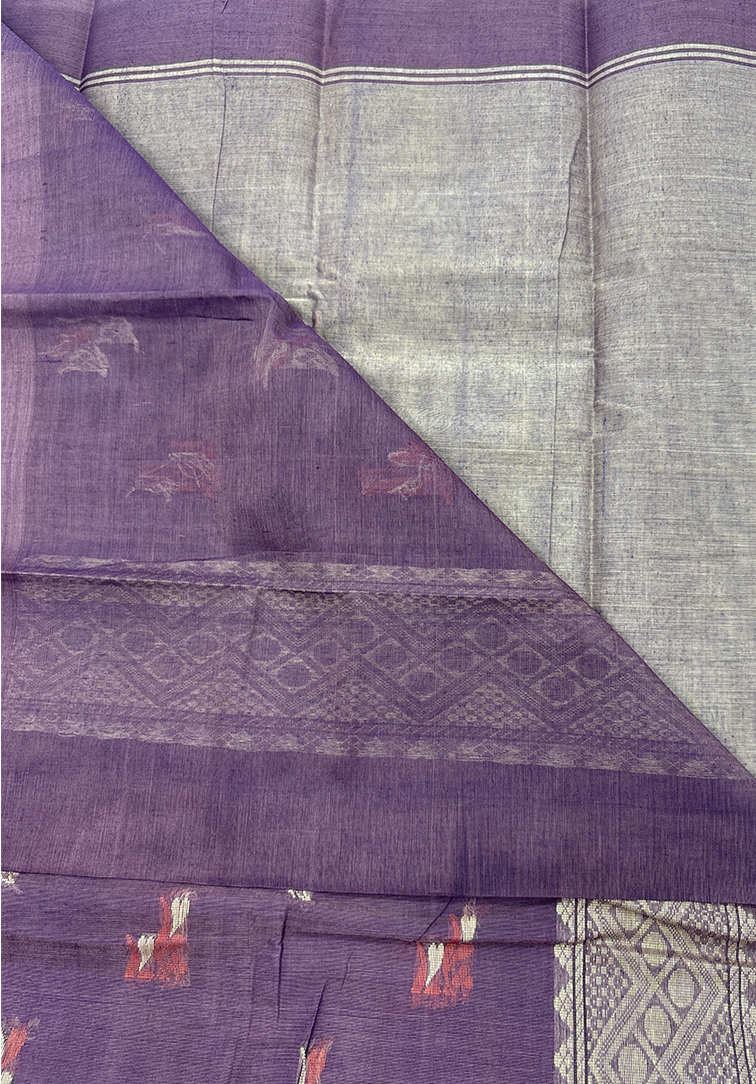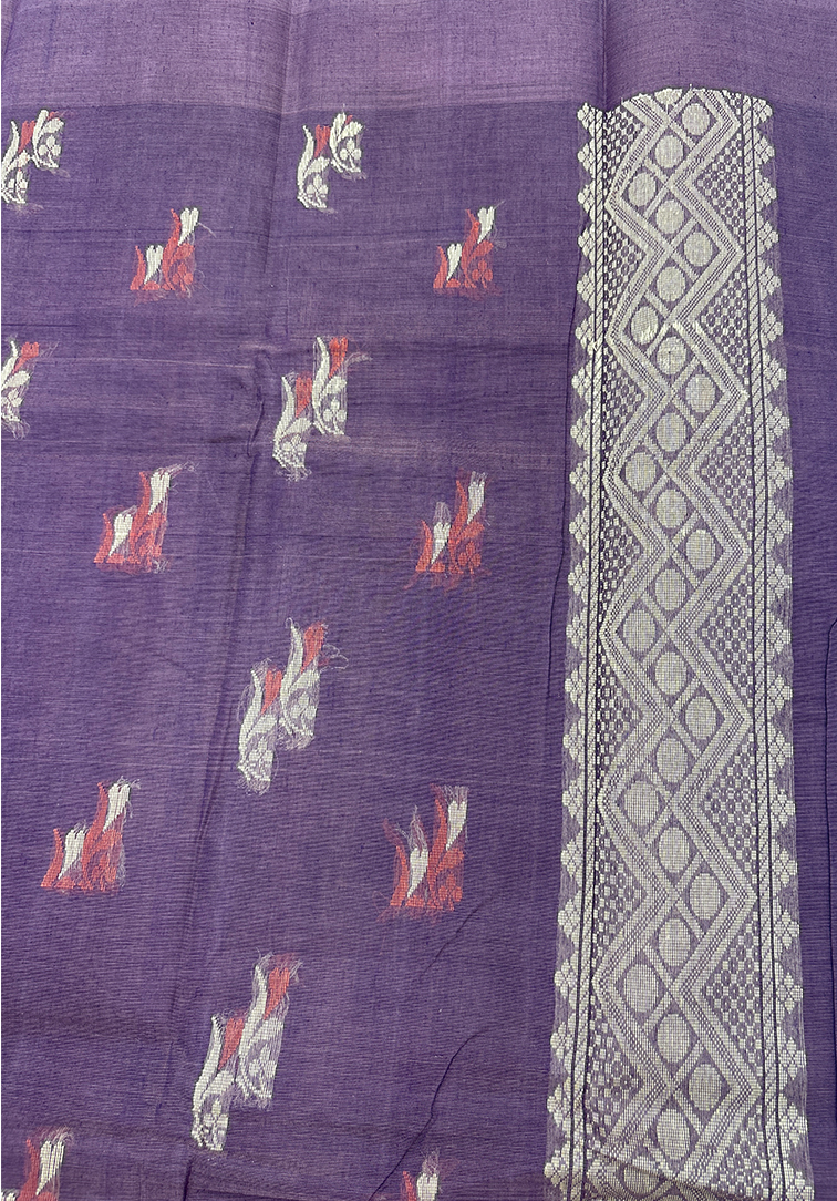 This elegant pure handloom cotton saree features a sophisticated brownish grey body, beautifully highlighted with intricate all-over thread work in dark purple and orange, adding a subtle pop of colour and traditional charm. The saree is finished with a plain contrast border in a soft muted purple, lending a refined and balanced look. Paired with a contrast muted purple blouse, this saree is perfect for everyday wear, office wear, and understated festive occasions. Lightweight, breathable, and handwoven with care, it offers timeless style with lasting comfort.