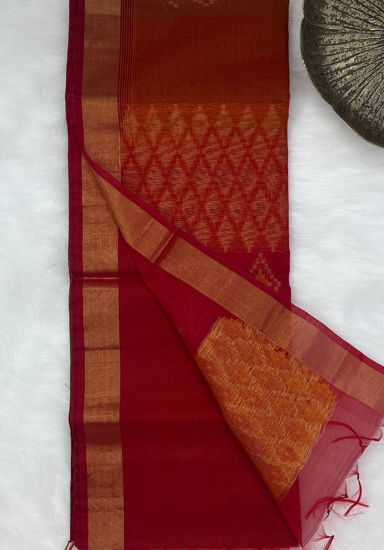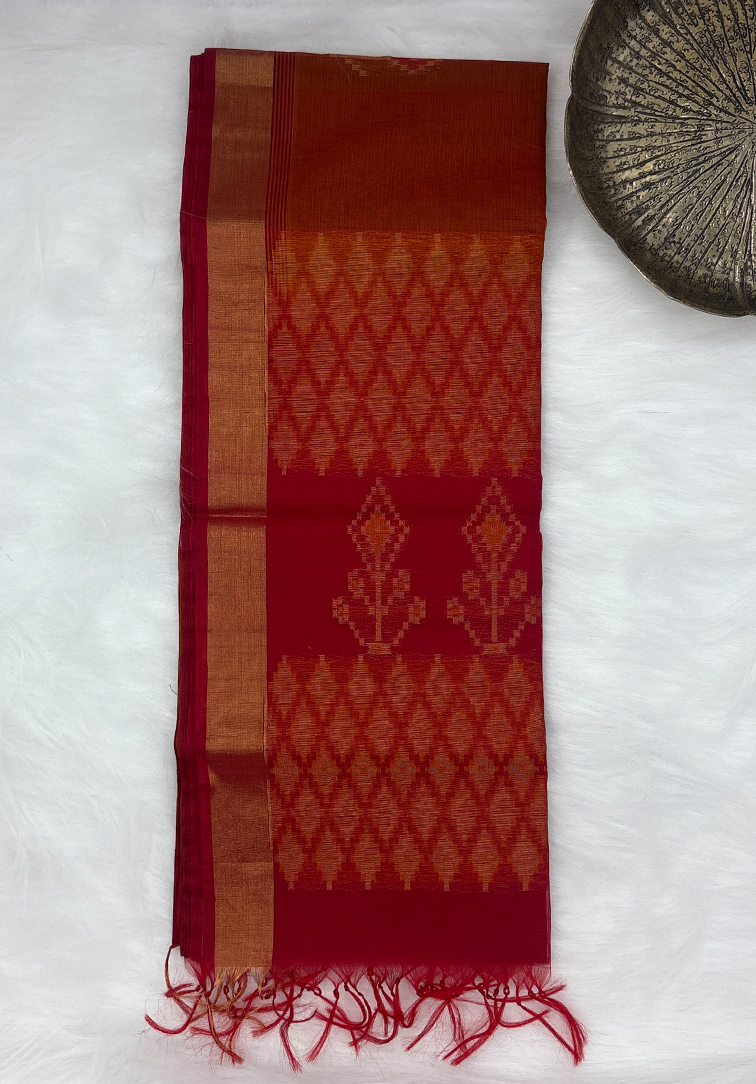 This exquisite pure handloom cotton silk saree is a beautiful representation of traditional craftsmanship blended with refined elegance. The saree features a rich rust brown body, intricately woven with subtle red thread detailing that adds depth and warmth to the fabric. Elegant golden zari motifs are delicately spread across the body, lending a graceful shimmer and timeless appeal. The saree is enhanced with a striking contrast red border, richly accented with intricate golden zari work that frames the drape beautifully. Completing the ensemble is a matching contrast plain red blouse, designed to balance the ornate saree, and finished with a complementary zari border for a cohesive look. Soft in texture yet rich in appearance, this handloom cotton silk saree offers excellent comfort along with a luxurious finish. Perfect for festive celebrations, weddings, traditional functions, and special occasions, it is a versatile addition to any ethnic wardrobe that celebrates heritage and sophistication.