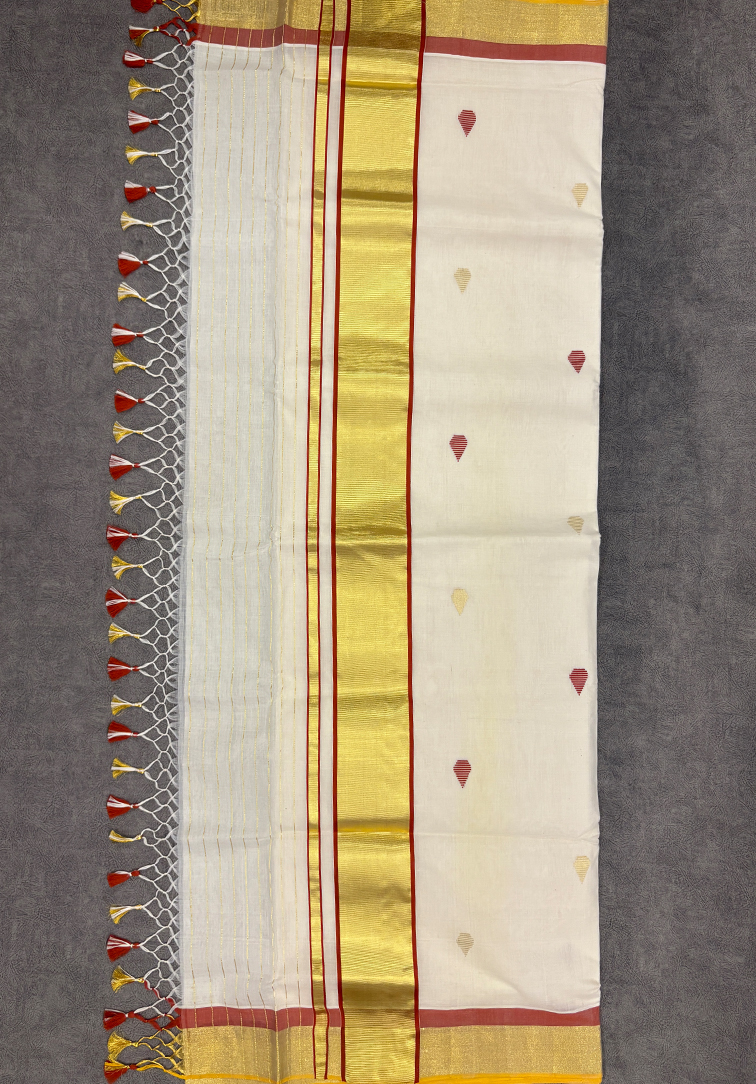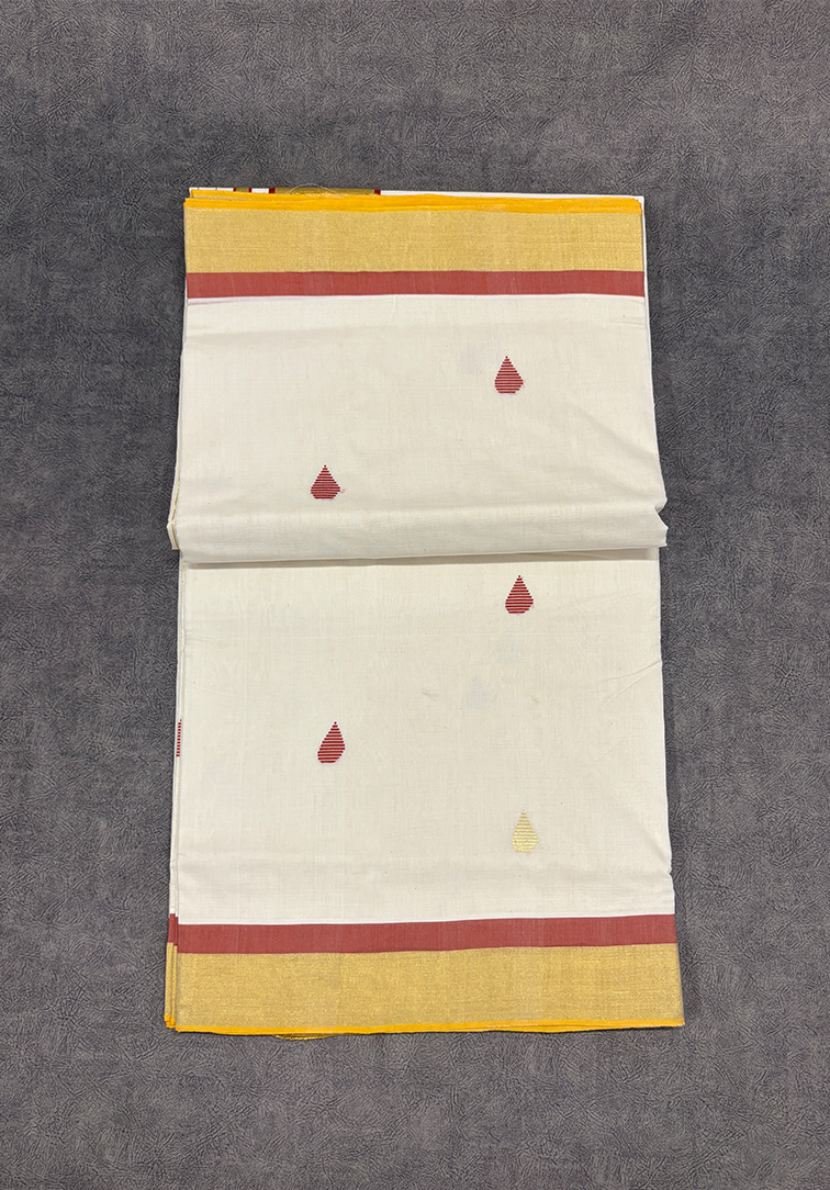 PURE UNAKUPAVU BALARAMAPURAM, KERALA HANDLOOM KASAVU SAREE A timeless expression of tradition, this classic Kerala pure handloom Kasavu saree is beautifully accented with rich burnt orange highlights, adding warmth and depth to its elegant ivory base. The saree features delicate orange and gold motifs woven gracefully throughout the body, creating a harmonious blend of heritage charm and refined luxury. Expertly handcrafted by skilled artisans, the signature gold Kasavu border lends a regal finish, while the natural handloom texture ensures comfort, breathability, and lasting quality. Comes with a matching running blouse, perfectly coordinated to complete the look. Ideal for festive occasions, temple wear, weddings, and cultural celebrations, this saree reflects the true soul of Kerala’s weaving legacy. ✨ A perfect choice for those who appreciate understated elegance with a touch of vibrant tradition.