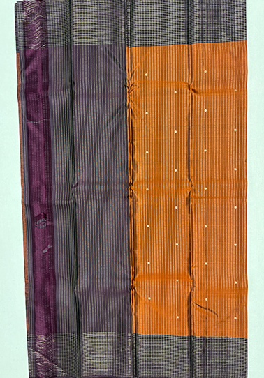 • Weave: Pure Kanchipuram handloom with fine zari line detailing • Body Colour: Burnt orange • Design: Simple zari lines with small chakra motifs across the body • Border: Contrast dark purple border with refined small check design • Blouse: Contrast dark purple blouse with simple lines and border check design • Occasion: Ideal for festive occasions, traditional gatherings, and elegant day functions
