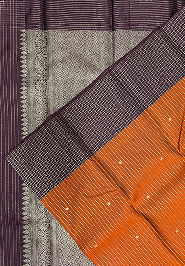 This elegant saree is a pure Kanchipuram handloom creation featuring a rich burnt orange body adorned with simple zari line detailing and delicately woven small chakra motifs, lending it a subtle yet traditional charm. The contrast dark purple border with a refined small check design adds depth and character to the saree. Complementing the look is a contrast dark purple blouse, designed with simple zari lines and border-inspired check detailing, creating a perfectly balanced ensemble that reflects timeless grace and premium craftsmanship.