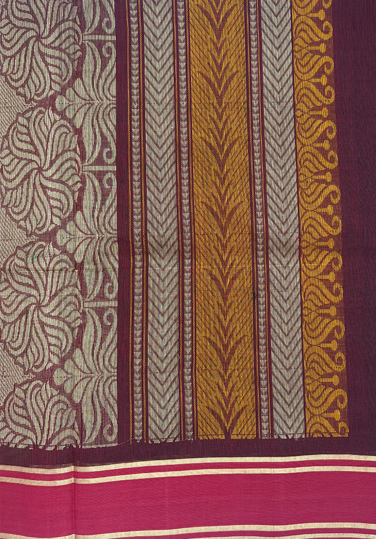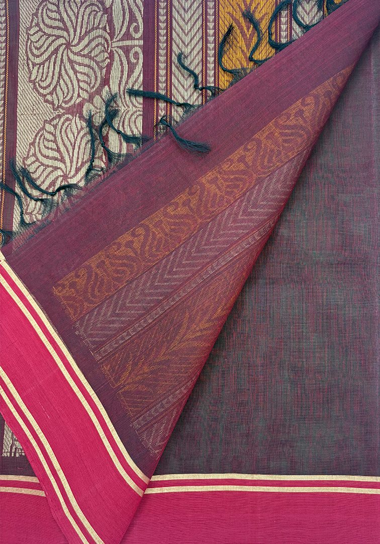 This elegant pure handloom cotton saree features a rich dark green body, beautifully enhanced with vertical line weaving and delicate small motif lines that add texture, rhythm, and a graceful elongating effect. The subtle body design lends a refined traditional charm while maintaining a clean, sophisticated look. The saree is complemented by a deep maroon contrast border, creating a bold and elegant frame that enhances the richness of the body colour. Completing the ensemble is a matching contrast deep maroon blouse, thoughtfully designed to provide a harmonious and polished finish. Soft, breathable, and comfortable to drape, this handloom cotton saree is ideal for daily wear, office wear, cultural gatherings, and understated festive occasions. A timeless blend of comfort, craftsmanship, and classic colour contrast.