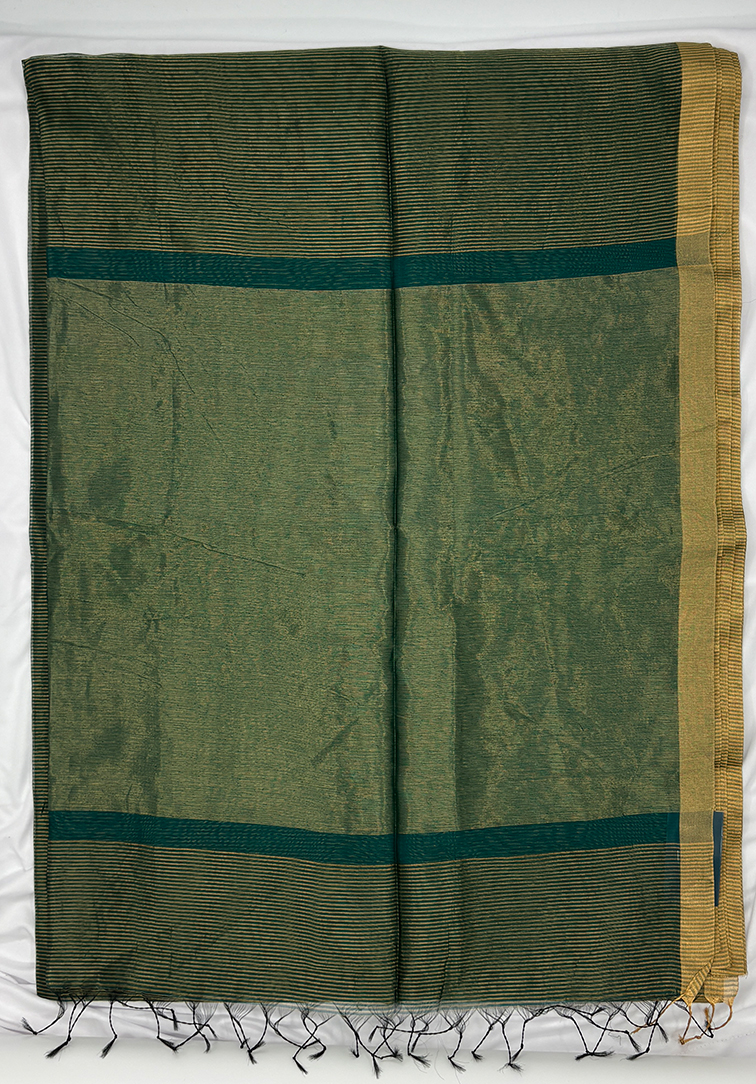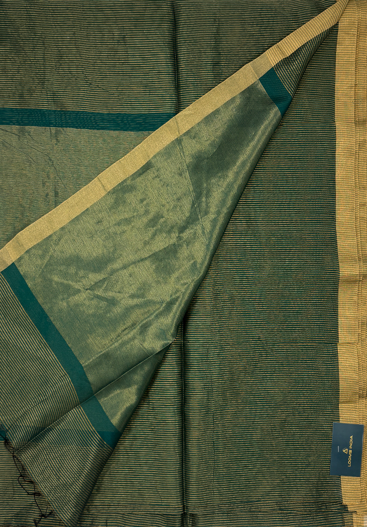 This exquisite Maheshwari handloom saree is crafted in a deep, dark greenish-blue shade, exuding elegance and traditional charm. The entire body of the saree is adorned with delicate zari tissue stripes, adding a subtle shimmer and a rich, textured appeal that enhances its overall sophistication. The simplicity of the zari border complements the intricate tissue work, maintaining a perfect balance between ornate detailing and understated refinement. The matching blouse, in the same dark greenish-blue shade and featuring all-over zari tissue stripes, seamlessly coordinates with the saree, creating a harmonious and polished look. Lightweight and breathable, the saree drapes effortlessly, offering both comfort and graceful movement, making it ideal for festive occasions, traditional ceremonies, cultural gatherings, and sophisticated day-to-evening events. Reflecting the timeless artistry and meticulous craftsmanship of Maheshwari weaving, this saree is a versatile addition to any ethnic wardrobe. Its combination of subtle shimmer, classic design, and graceful drape ensures that it remains a cherished piece for years, perfect for those who appreciate refined elegance and heritage-inspired style.