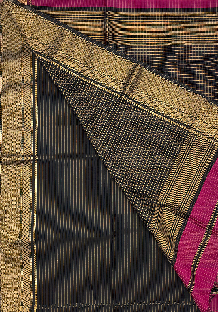 A striking saree crafted with a rich dark magenta body, adorned with elegant horizontal zari lines that add depth and subtle shimmer. The contrast beetroot-shaded border with classic zari detailing enhances its regal appeal. Paired with a contrast black blouse highlighted by refined zari lines, this saree embodies timeless elegance and graceful sophistication.