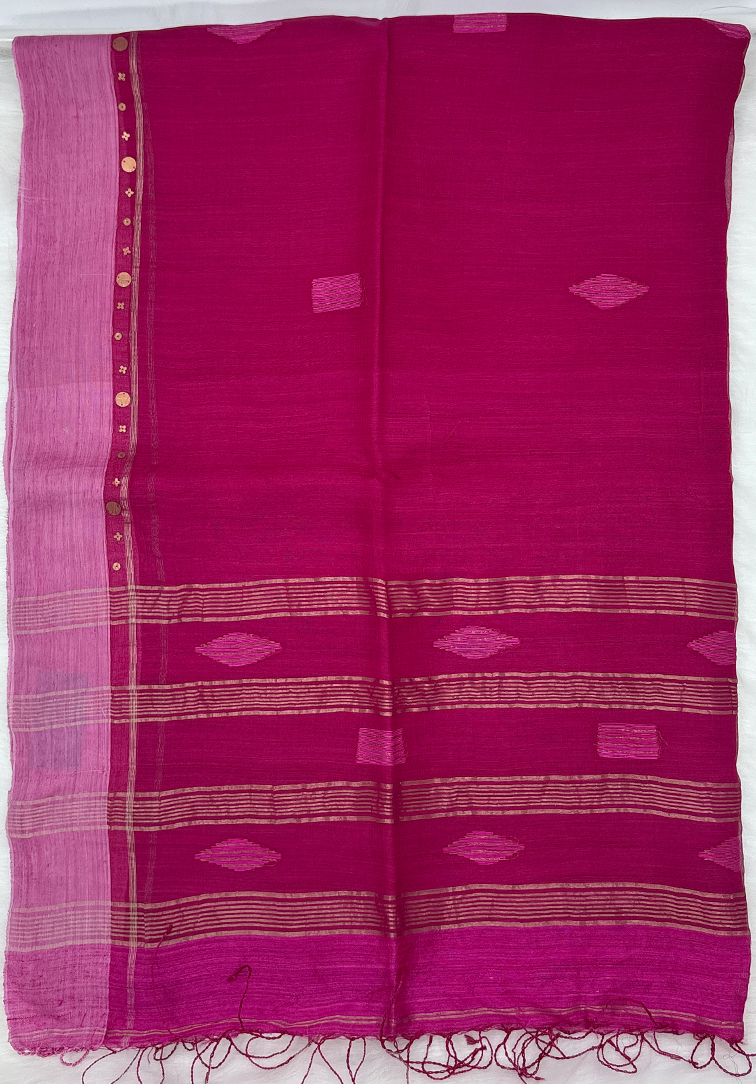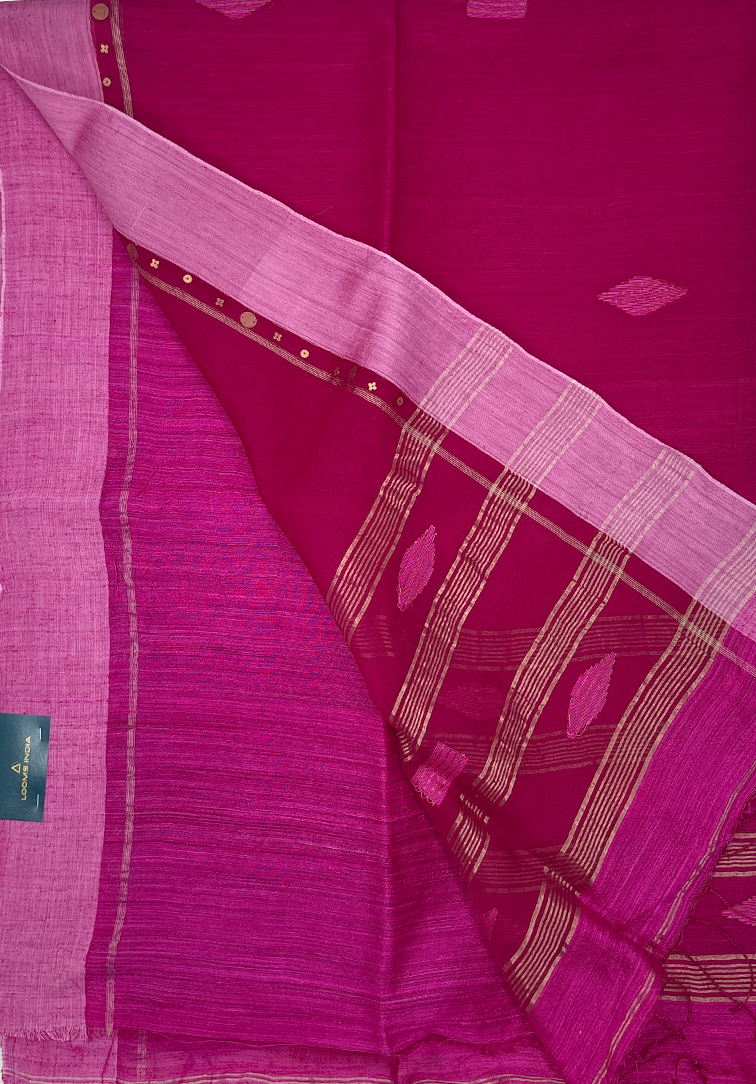 This exquisite Kora silk saree is crafted in a rich dark magenta hue, offering a look of deep elegance and refined charm. The body is beautifully adorned with intricate all-over thread work, adding texture and artisanal detail while highlighting the natural lightness and subtle sheen of Kora silk. The saree is accentuated with a contrast light pink border featuring delicate Gini work, creating a soft yet striking visual balance. The contrast border adds a graceful highlight and enhances the overall aesthetic with understated sophistication. Paired with a dark magenta Matka silk blouse, the ensemble is completed with a touch of rustic elegance and comfort. The blouse perfectly complements the saree, adding depth and a rich handloom finish to the look. Ideal for festive occasions, cultural celebrations, and elegant traditional gatherings, this Kora silk saree is a timeless addition to any curated wardrobe.