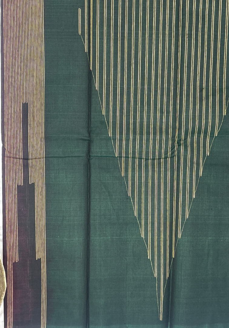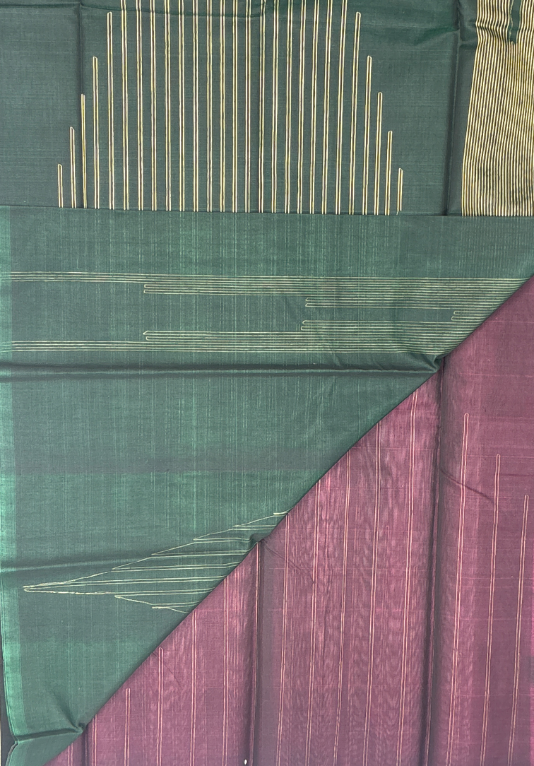 This elegant pure handloom cotton silk saree features a rich plain dark purple body, exuding regal charm and timeless sophistication. The deep, luxurious hue of the body creates a striking canvas that beautifully complements the traditional border detailing. The saree is accentuated with a statement one-side border, intricately woven with beige thread in a classic temple design running along the entire border, adding architectural elegance and heritage depth. Completing the ensemble is a contrast dark green blouse, thoughtfully designed to enhance the richness of the saree and create a bold yet harmonious finish. Soft, breathable, and comfortable to drape, this handloom cotton silk saree is ideal for festive occasions, temple ceremonies, and traditional celebrations. A graceful blend of rich color tones and authentic handloom craftsmanship.