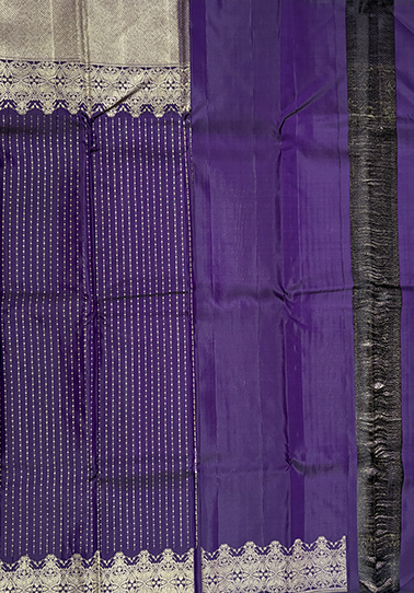 • Weave: Pure Kanchipuram handloom • Body Colour: Dark purple • Design: Subtle zari line pattern across the body • Border: Self-colour Banarasi-style broad running border • Blouse: Self-colour plain blouse with matching border • Occasion: Perfect for weddings, festive celebrations, evening functions, and traditional gatherings