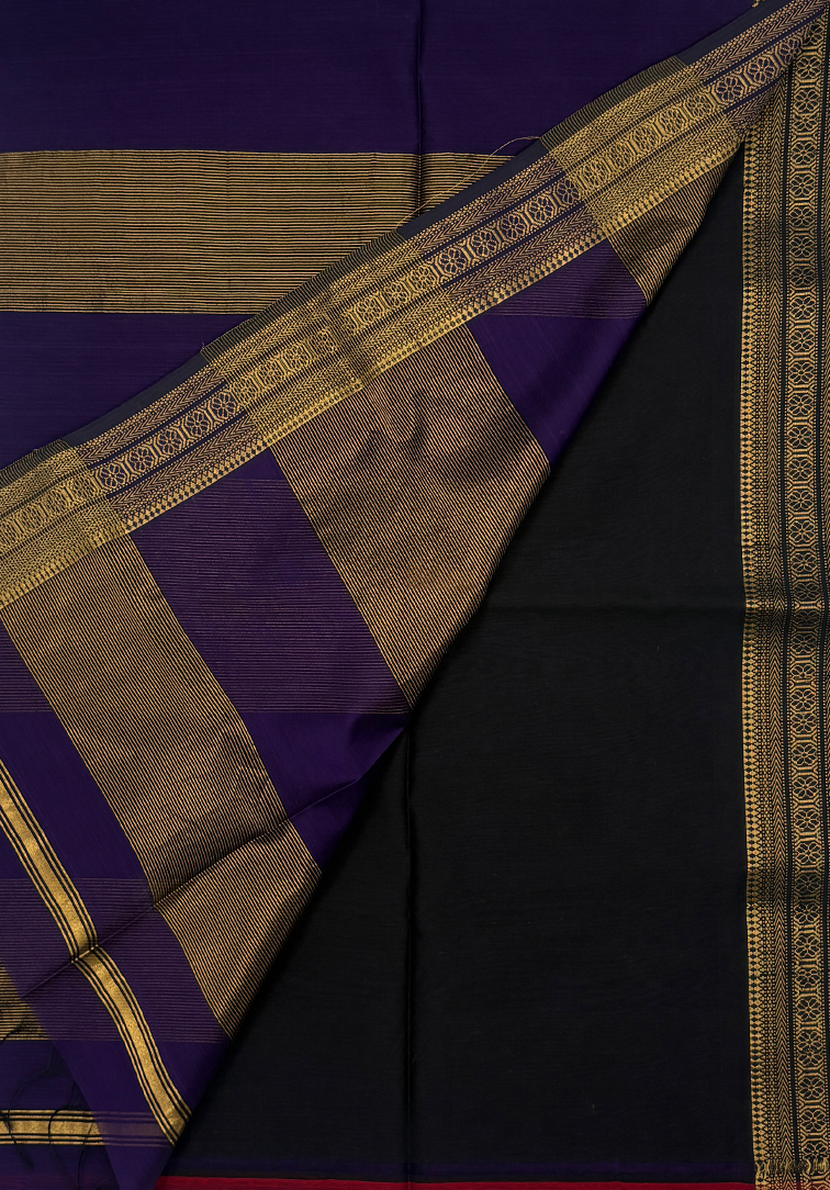 This graceful handloom Maheshwari saree comes in a regal dark violet body, radiating elegance and refined charm. The saree is enhanced with a classic zari border, lending a soft festive glow that beautifully complements the deep hue of the body. It is paired with a contrast black blouse featuring a coordinated border, creating a bold and sophisticated finish. Light in weight with a fluid drape, this Maheshwari saree is ideal for festive occasions, traditional celebrations, and elegant evening wear. A timeless piece that reflects authentic handloom artistry, this saree effortlessly blends traditional richness with contemporary contrast, making it a versatile addition to any curated wardrobe.