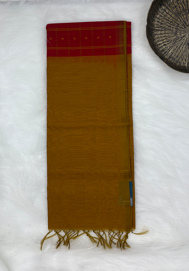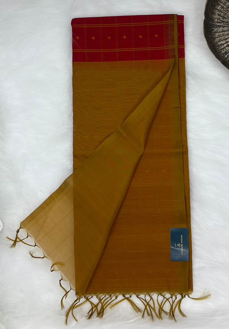 A vibrant pure handloom cotton silk saree in a striking deep red hue, beautifully enhanced with all-over check buttas that bring texture, rhythm, and traditional charm to the body. The subtle sheen of cotton silk elevates the weave, creating a graceful balance between richness and comfort. The saree is elegantly finished with a dark mustard yellow line border, offering a warm contrast that frames the red body with refined simplicity. Complementing the saree is a contrast mustard yellow plain blouse, thoughtfully designed to highlight the saree’s colour palette while keeping the overall look effortlessly sophisticated. Lightweight yet luxurious, this saree is perfect for festive occasions, temple visits, and elegant daytime celebrations—an expression of timeless handloom artistry blended with contemporary grace.