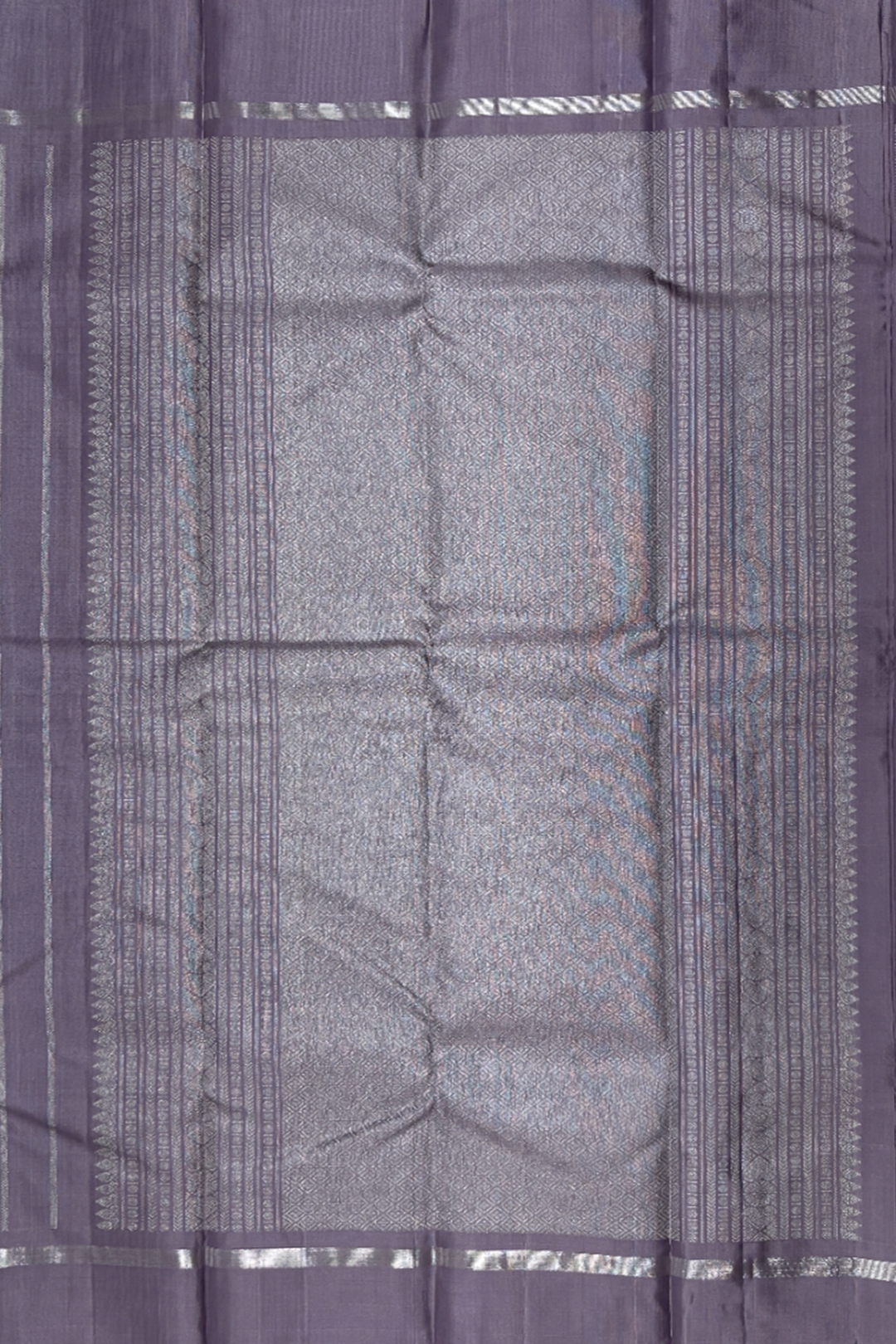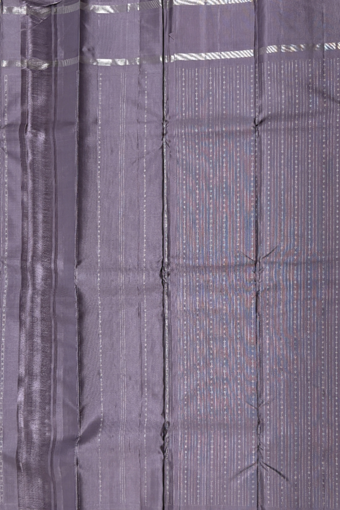This graceful pure Kanchipuram handloom saree is a perfect blend of contemporary elegance and traditional craftsmanship. The refined dusky lavender body is beautifully enhanced with all-over vertical silver zari designs, creating a sleek, elongated silhouette with a soft, luminous sheen. The saree is finished with a self-coloured simple silver zari border that adds understated sophistication while keeping the focus on the elegant body pattern. Complementing the saree is a matching self blouse, woven with vertical silver lines and finished with a neat, simple border for a coordinated and polished look. Handwoven in pure silk with authentic silver zari by skilled Kanchipuram artisans, this saree is ideal for weddings, receptions, festive occasions, and elegant celebrations. A timeless piece, it reflects the rich heritage, durability, and refined beauty that define pure Kanchipuram handloom sarees.