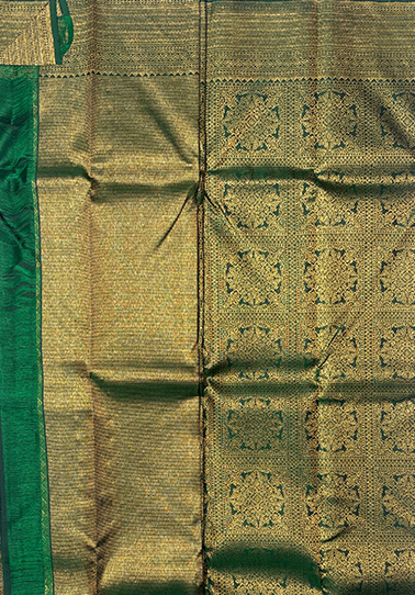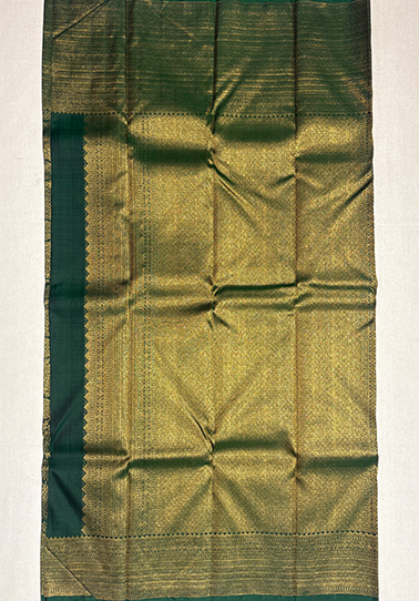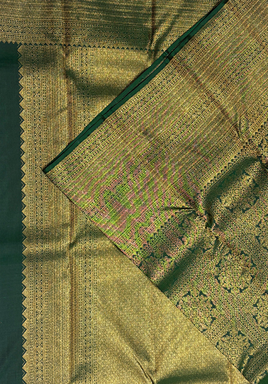 • Weave: Pure Kanchipuram Handloom • Colour: Dark Bottle Green • Design: Full-body kolam brocade • Border: Broad Banarasi running border with zari • Blouse: Full tissue zari brocade blouse piece • Occasion: Wedding, festive, ceremonial, traditional events