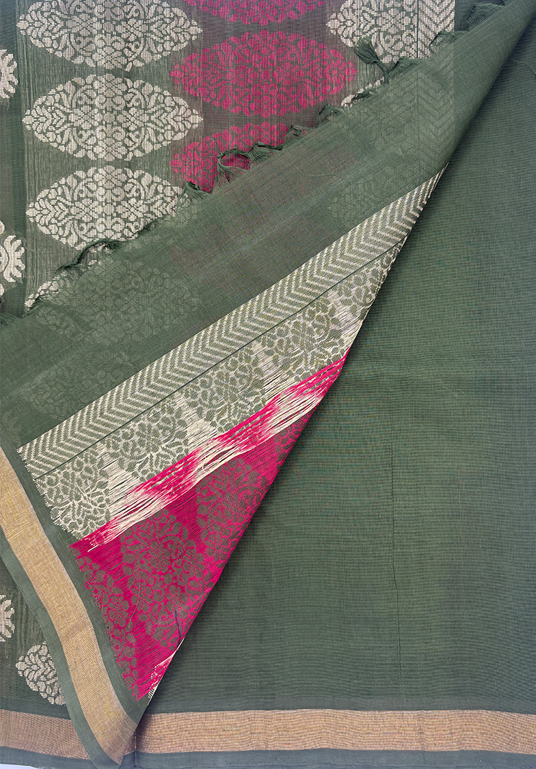 A soothing muted green handloom cotton saree highlighted with all-over beige and maroon mango thread weaving, celebrating classic South Indian motifs. The saree is beautifully framed with a contrast seaweed green border, adding depth and refinement. Finished with a contrast seaweed green blouse, this piece is understated, graceful, and effortlessly timeless. Perfect for those who love heritage weaves with a calm, earthy palette