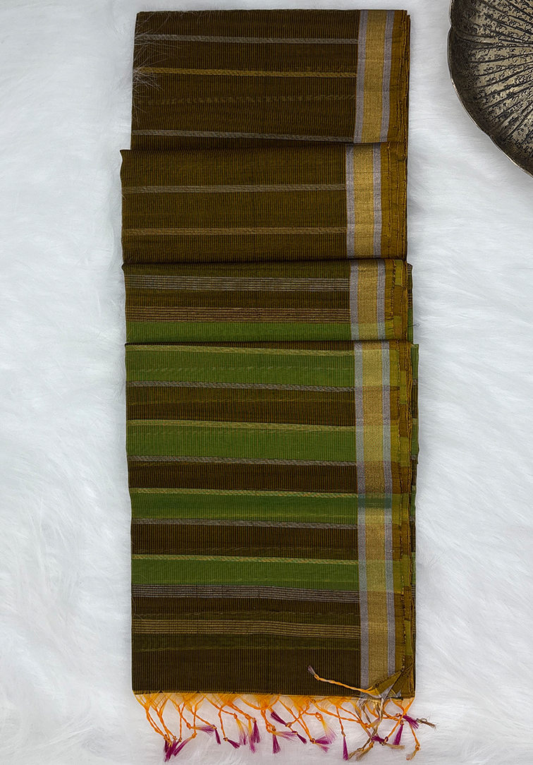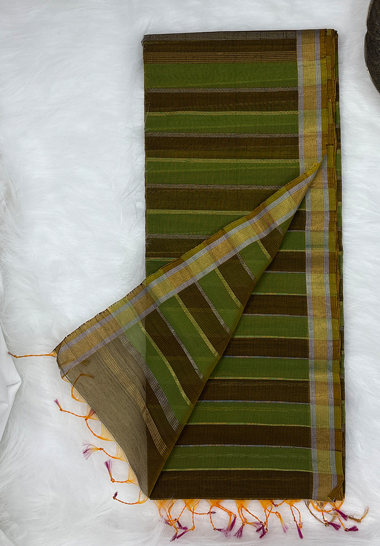 A graceful pure handloom cotton silk saree in a rich army green body, adorned with silver and golden zari vertical designs running beautifully across the length of the saree. The self-colour border is enhanced with a refined blend of gold and silver zari, adding a subtle yet luxurious finish. The saree is paired with a self-colour blouse, highlighted by olive green accents and golden and silver zari stripes all over, completed with a matching silver and gold zari border. An elegant blend of tradition and sophistication—perfect for festive wear, office elegance, and special occasions.