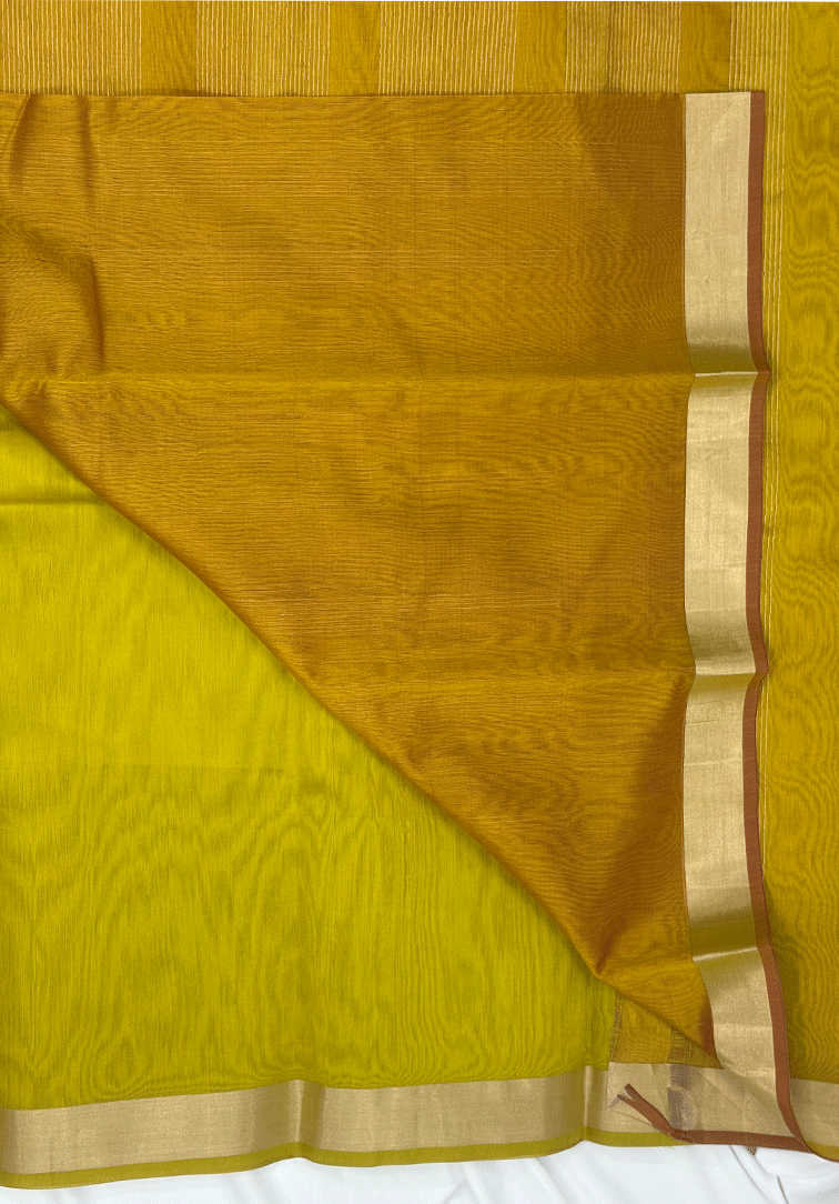 This elegant pure handloom cotton silk saree features a serene green tea–coloured body, intricately woven with antique zari and chikoo thread detailing in an all-over design that adds depth, texture, and timeless sophistication. The soft, earthy tone of the body beautifully highlights the subtle shimmer of the antique zari, showcasing the finesse of traditional handloom craftsmanship. The saree is complemented by a self-colour antique zari plain Bavanji border, offering a refined and understated frame that enhances the richness of the body without overpowering its intricate weaving. Completing the ensemble is a contrast dual-tone blouse in shades of green tea and pink, thoughtfully designed with a plain border to create a harmonious and polished finish. Soft, breathable, and comfortable to drape, this handloom cotton silk saree is ideal for festive occasions, temple ceremonies, and elegant celebrations. A graceful blend of heritage artistry, subtle luxury, and enduring handloom craftsmanship.