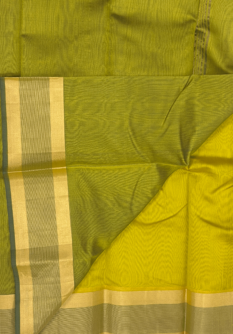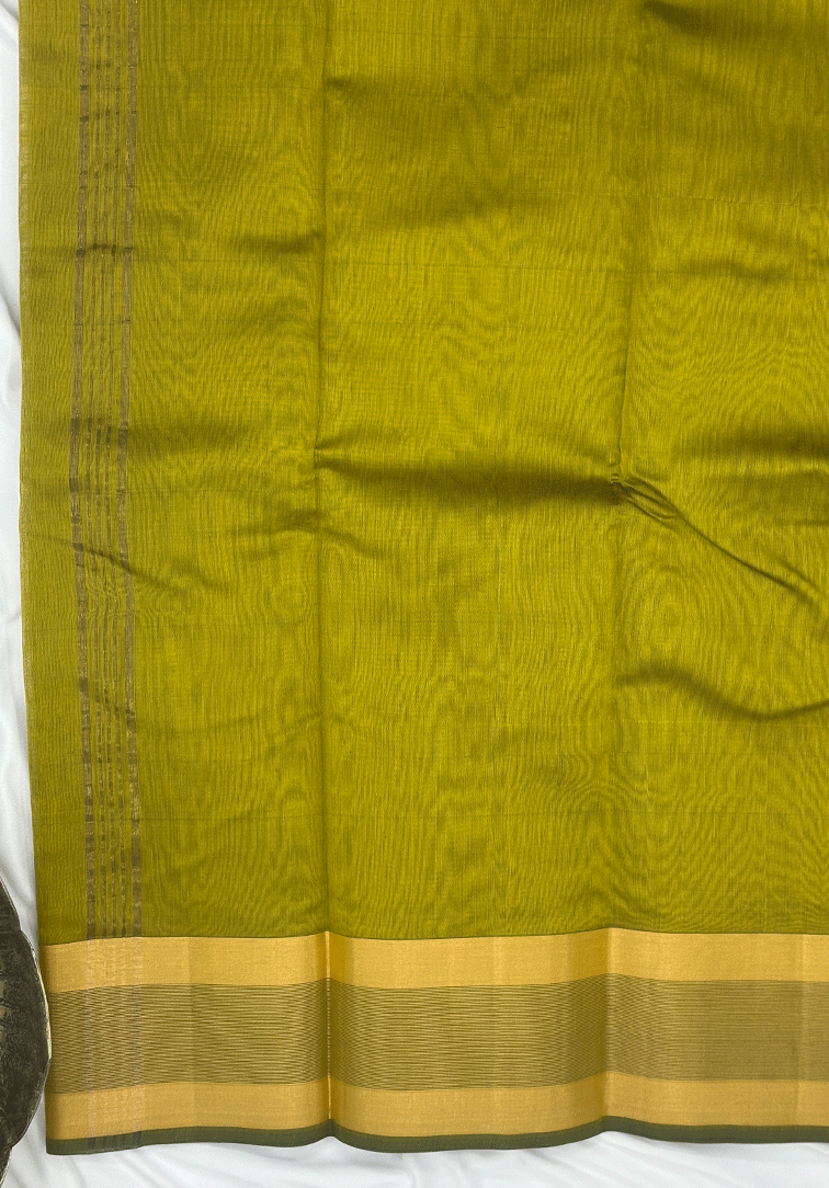 This elegant pure handloom cotton silk saree features a serene plain green tea–coloured body, offering a soft, earthy elegance with a contemporary yet timeless appeal. The subtle tone of the body creates a graceful canvas that highlights the richness of the contrasting border. The saree is beautifully finished with a contrast army green border, intricately woven with antique zari work that adds a touch of heritage charm and understated shimmer. Completing the ensemble is a matching plain army green blouse, thoughtfully designed with a coordinated zari border for a cohesive and polished look. Lightweight, breathable, and comfortable to drape, this handloom cotton silk saree is ideal for festive occasions, traditional ceremonies, and elegant daytime gatherings. A perfect blend of muted sophistication and classic handloom craftsmanship.