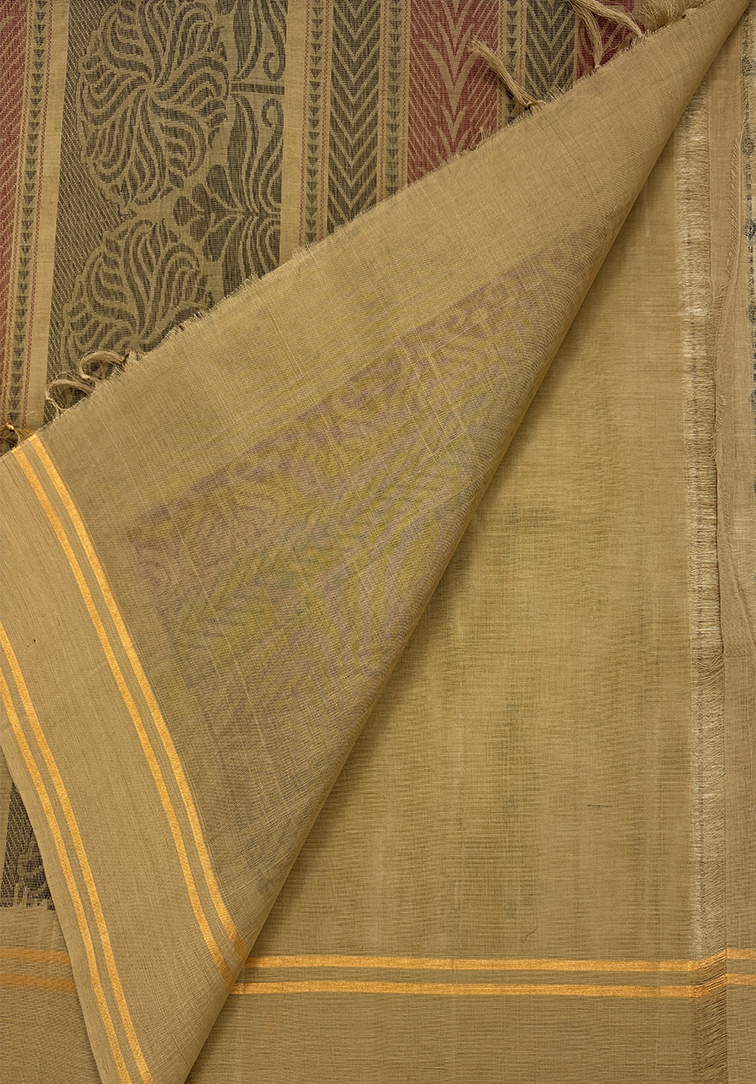 This elegant pure handloom cotton saree features a sophisticated grey body, offering a calm and contemporary appeal with timeless charm. The body is beautifully detailed with subtle vertical line weaving, adding texture and a graceful elongating effect to the drape. The saree is complemented by a soft contrast light brown border, creating a warm and balanced frame that enhances the understated elegance of the grey body. Completing the ensemble is a matching contrast brown blouse, thoughtfully designed to provide a cohesive and polished finish. Soft, breathable, and comfortable for all-day wear, this handloom cotton saree is ideal for office wear, daily elegance, and cultural gatherings. A perfect blend of minimal design, comfort, and authentic handloom craftsmanship.