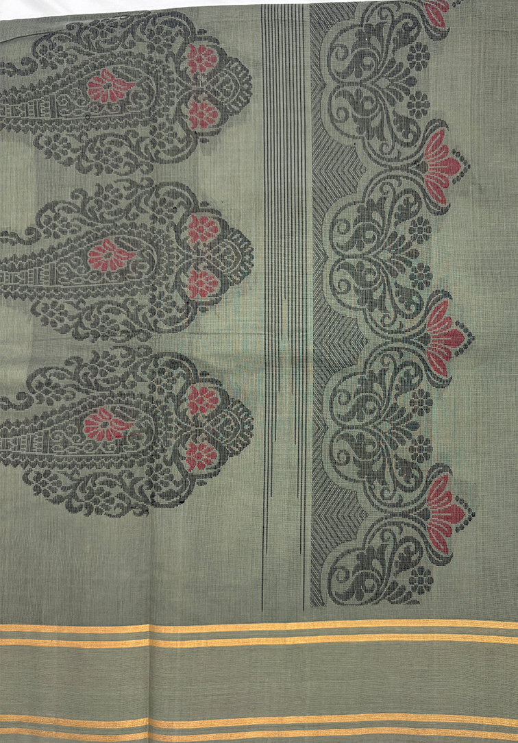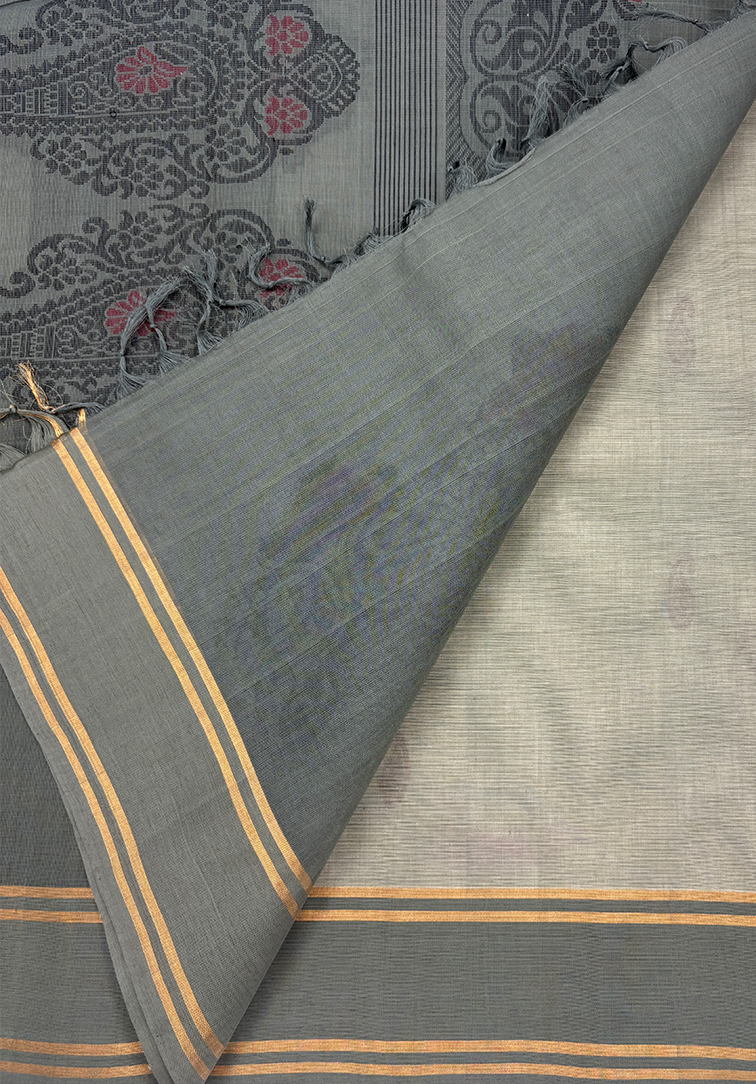 This elegant pure handloom cotton saree features a graceful light grey body, offering a serene and contemporary appeal. The body is beautifully adorned with classic paisley motifs, adding a touch of traditional artistry and refined texture to the drape. The saree is finished with a contrasting dark grey border, creating a sleek and sophisticated frame that enhances the subtle elegance of the body colour. Completing the ensemble is a matching contrast dark grey blouse, thoughtfully designed to deliver a cohesive and polished look. Soft, breathable, and comfortable for all-day wear, this handloom cotton saree is ideal for office wear, cultural gatherings, and understated festive occasions. A timeless blend of modern tones, traditional motifs, and authentic handloom craftsmanship.