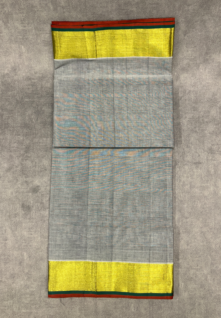 PURE UNAKUPAVU BALARAMAPURAM, KERALA HANDLOOM KASAVU SAREE This elegant grey pure handloom Kasavu saree is a beautiful blend of tradition and contemporary charm. The subtle grey body provides a refined backdrop, while the kasavu is enhanced with delicate multi-colour highlights that add a vibrant yet tasteful contrast. The colourful accents bring a fresh dimension to the classic Kasavu weave, making the saree stand out with understated sophistication. Handwoven by skilled artisans using traditional Kerala handloom techniques, this saree offers a soft texture and graceful drape. Paired with a matching running blouse, it is an ideal choice for festive occasions, cultural celebrations, temple visits, and elegant daytime wear. A timeless handloom creation, this Kasavu saree perfectly balances heritage craftsmanship with modern elegance.