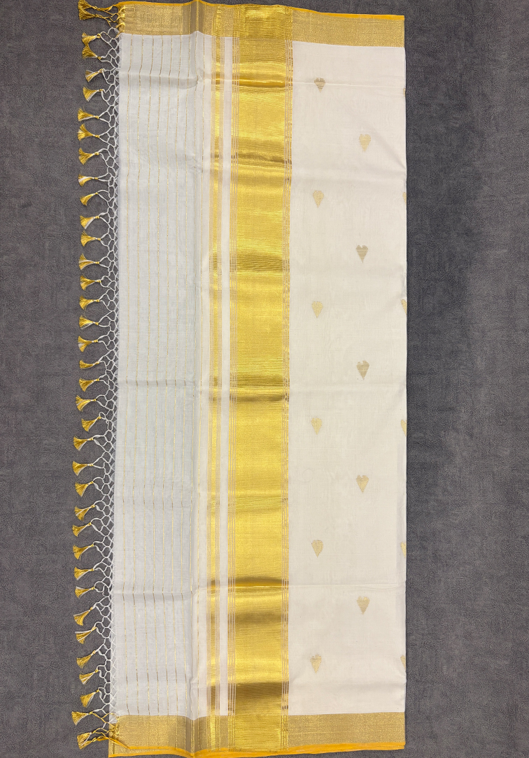 PURE UNAKUPAVU BALARAMAPURAM, KERALA HANDLOOM KASAVU SAREE This charming pure handloom Kerala Kasavu saree beautifully blends tradition with a touch of contemporary elegance. The body is adorned with delicate heart motifs woven all over, adding a subtle yet distinctive character while maintaining the classic simplicity of the Kasavu weave. Crafted in authentic handloom fabric, the saree reflects the timeless appeal of Kerala craftsmanship. The evenly placed motifs enhance the body without overpowering it, making the saree both graceful and unique. Perfect for festive mornings, Onam celebrations, temple visits, and elegant day occasions, this pure handloom Kerala Kasavu saree is an ideal choice for those who appreciate traditional weaves with a modern, artistic twist.