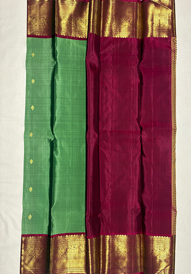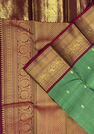 An exquisite pure Kanchipuram handloom saree in a regal jade green hue, gracefully embellished with finely woven small zari motifs across the body, creating a subtle shimmer with every movement. The rich texture of the silk reflects the mastery of traditional Kanchipuram weaving, making it a timeless heirloom piece. The saree is elevated with a striking contrast Arak red border, intricately woven with auspicious Yanai (elephant) and Kuthirai (horse) motifs in a perfectly balanced equal-border design, symbolising strength, prosperity, and heritage artistry. The luminous zari work adds depth and grandeur, framing the saree with royal elegance. Paired with a contrast Arak red blouse, kept elegantly plain and finished with the same ornate border as the saree, this ensemble is a celebration of classic South Indian craftsmanship—ideal for weddings, temple ceremonies, and grand festive occasions.