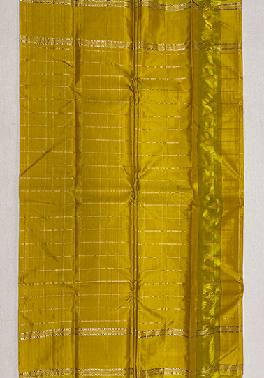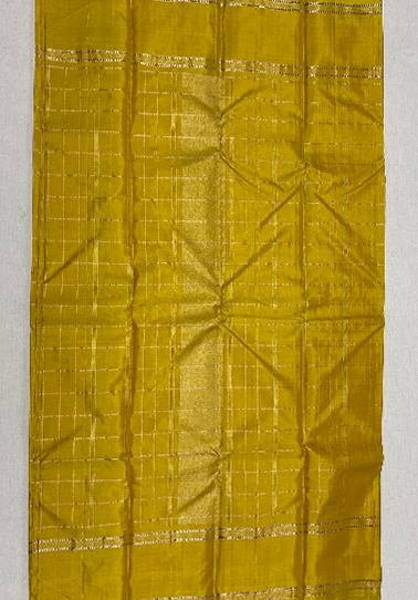 • Weave: Pure Kanchipuram handloom with jute and zari detailing • Body Colour: Lemon yellow • Design: All-over silver check pattern with subtle vertical jute weaving • Border: Jute-woven border with simple golden and silver zari lines • Blouse: Self-colour blouse with all-over check design and simple border • Occasion: Ideal for festive wear, weddings, elegant day functions, and traditional gatherings
