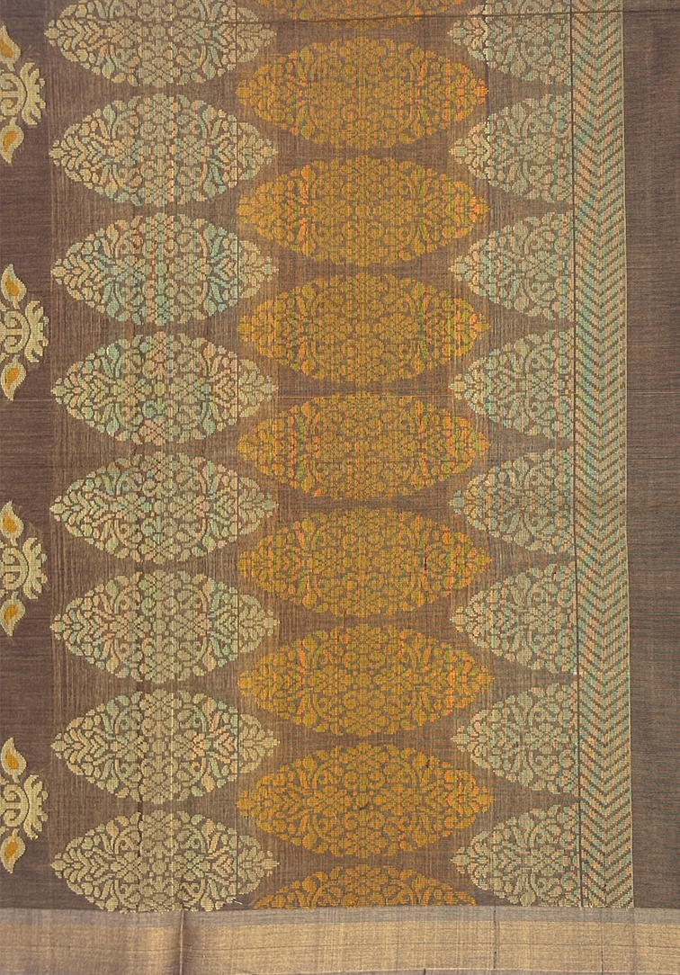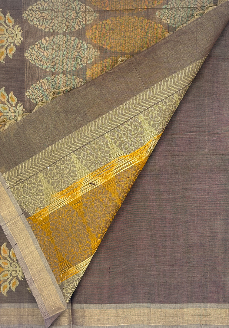 A rich light burgundy handloom cotton saree adorned with all-over beige and orange mango thread weaving, bringing a beautiful touch of tradition and vibrance. The saree is finished with a contrast walnut cream border, adding softness and balance to the deep body tone. Paired with a contrast muted brown blouse, this piece feels timeless, graceful, and thoughtfully curated. An earthy palette with classic mango motifs — perfect for those who love subtle luxury in handloom weaves