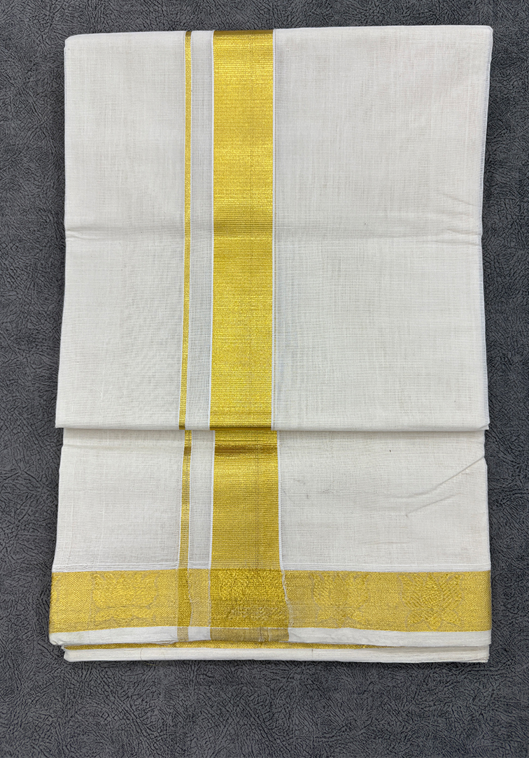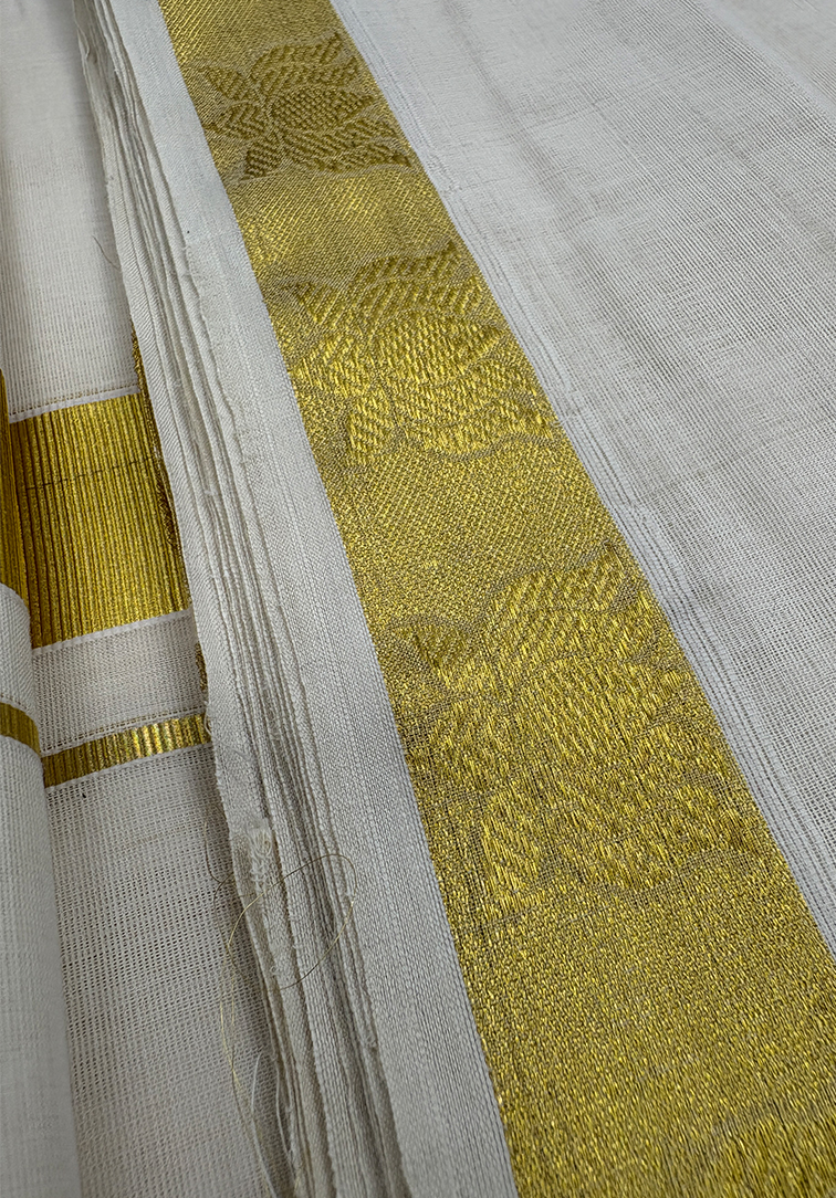 PURE UNAKUPAVU BALARAMAPURAM, KERALA HANDLOOM KASAVU MUNDU Pure handloom Kasavu mundu crafted in a classic off-white base, enriched with a golden kasavu border featuring elegant lotus designs along the bottom. Woven in fine cotton with traditional detailing, this mundu reflects timeless Kerala handloom craftsmanship and is ideal for temple wear, festive occasions, and traditional ceremonies.