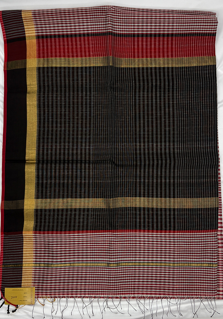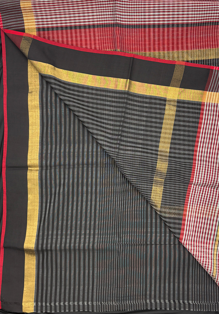 This elegant Maheshwari handloom saree features a graceful cream and maroon body woven with delicate small checks, reflecting the weave’s signature balance of simplicity and sophistication. Lightweight and breathable, the saree offers the hallmark comfort of authentic Maheshwari craftsmanship, known for its crisp texture, easy drape, and refined finish. The saree is beautifully framed with a striking border in golden zari, accented with black and highlighted by a fine red piping that adds depth and definition. Paired with contrast black and grey striped blouses finished with a zari border, this timeless piece blends traditional charm with contemporary elegance, making it perfect for festive occasions, cultural gatherings, and polished everyday wear.