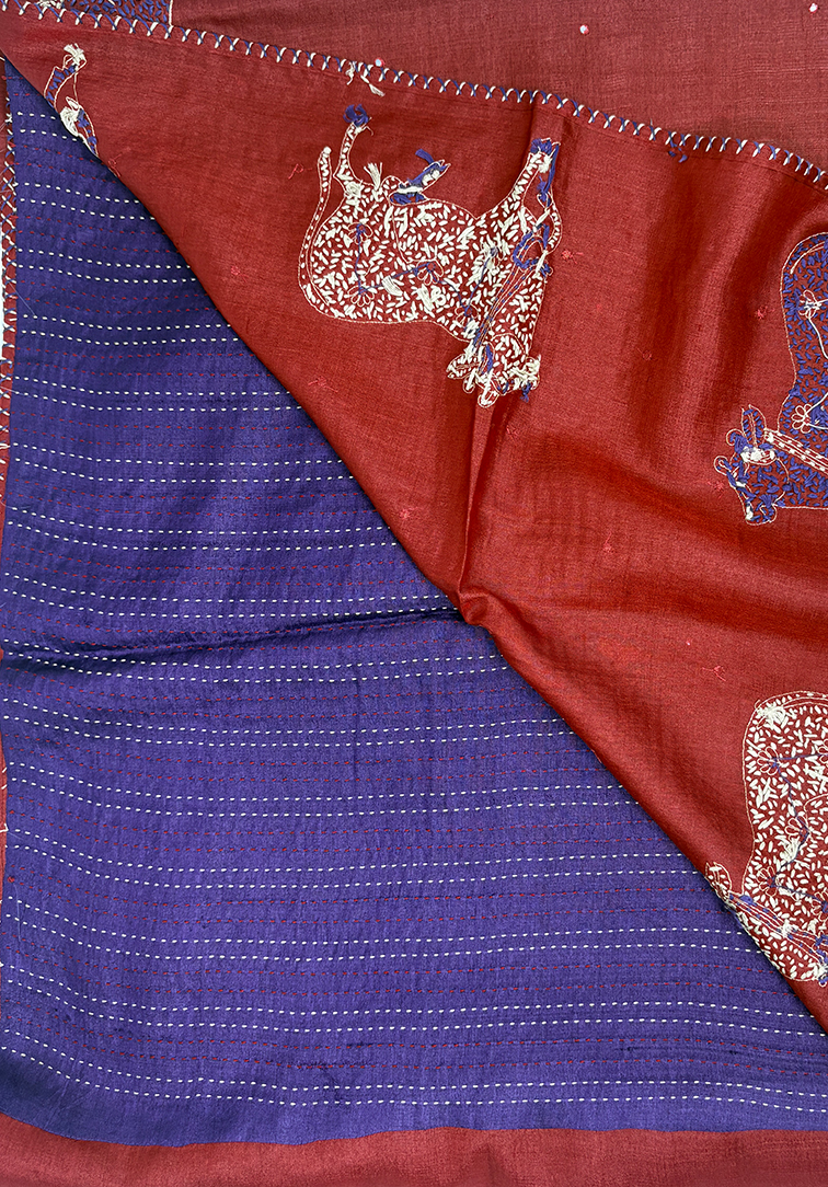 An opulent maroon luxury saree brought to life with all-over handcrafted Kutch embroidery and fine mirror work, where every motif tells a story of heritage and meticulous craftsmanship. The intricate detailing across the body creates depth, texture, and a subtle play of light, making this piece truly captivating. The saree is elegantly finished with a refined Kutch-embroidered border, designed to enhance the richness of the body while maintaining a sense of understated sophistication. Paired with a contrast violet blouse, beautifully adorned with vertical Kutch embroidery stripes, the ensemble achieves a perfect balance of bold contrast and harmonious design. A timeless creation that embodies artisanal luxury, cultural legacy, and elevated elegance — ideal for grand celebrations, festive soirées, and heirloom wardrobes.