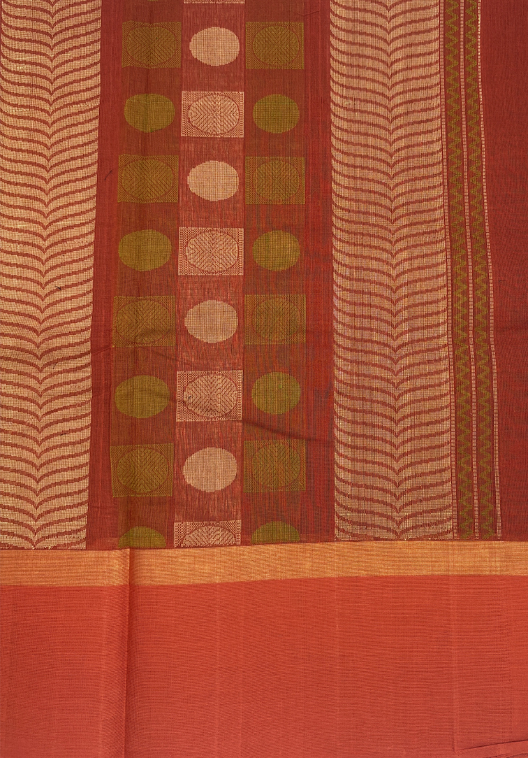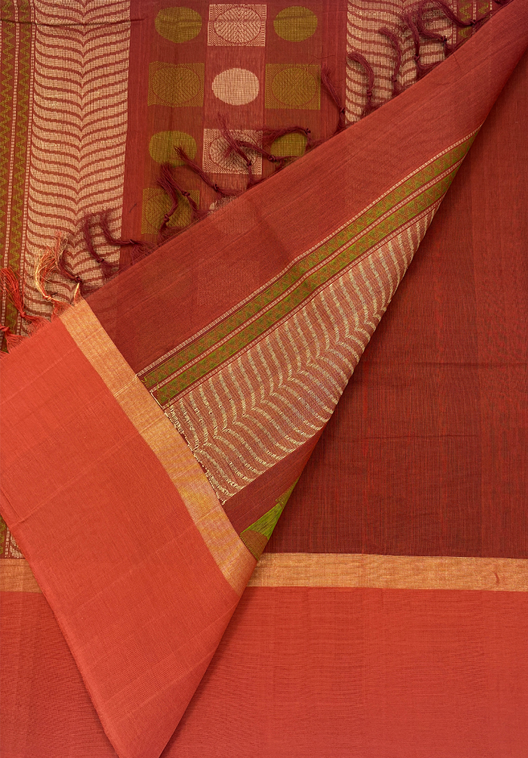 This elegant pure handloom cotton saree features a rich mehendi green body, exuding earthy charm and timeless sophistication. The body is beautifully adorned with delicate small booti motifs, adding subtle texture and traditional character to the overall drape. The saree is enhanced with a striking contrast rust orange border, creating a warm and vibrant frame that perfectly complements the deep green body. Completing the ensemble is a matching contrast rust orange blouse, thoughtfully designed to provide a harmonious and polished finish. Soft, breathable, and comfortable to wear, this handloom cotton saree is ideal for daily wear, office elegance, cultural gatherings, and understated festive occasions. A graceful blend of traditional motifs, rich colour contrast, and authentic handloom craftsmanship.