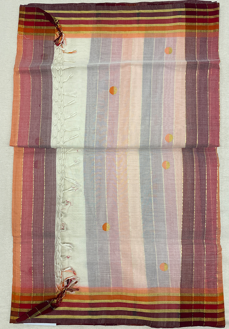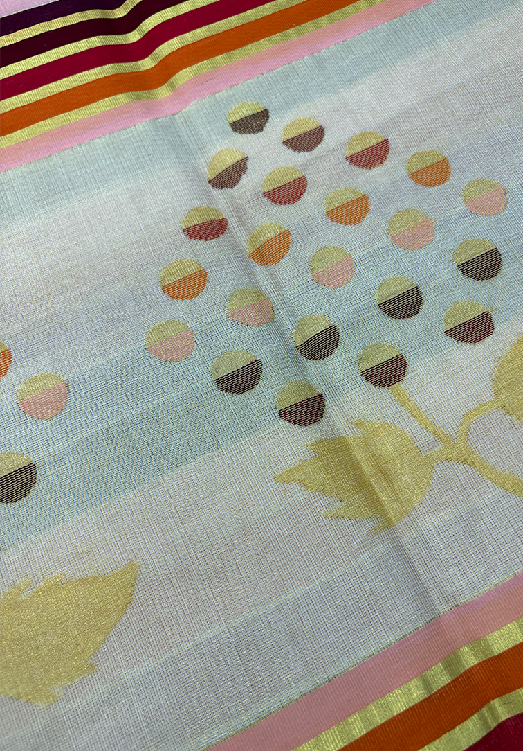 PURE UNAKUPAVU BALARAMAPURAM, KERALA HANDLOOM KASAVU SAREE Pure handloom Kasavu saree featuring an elegant off-white body with golden, maroon, and orange thread polka designs woven all over. Accentuated by a rich multicolour border in peach, orange, red, maroon, and brown with golden zari, the saree exudes vibrant traditional charm. The pallu is woven in multicolour kasavu and highlighted with a graceful cluster of grapes motif, adding a distinctive handcrafted touch. Paired with a matching blouse featuring multicolour vertical stripes in peach, orange, red, maroon, and brown with golden zari, this saree beautifully reflects festive elegance and authentic Kerala handloom artistry.