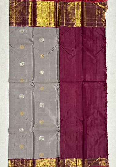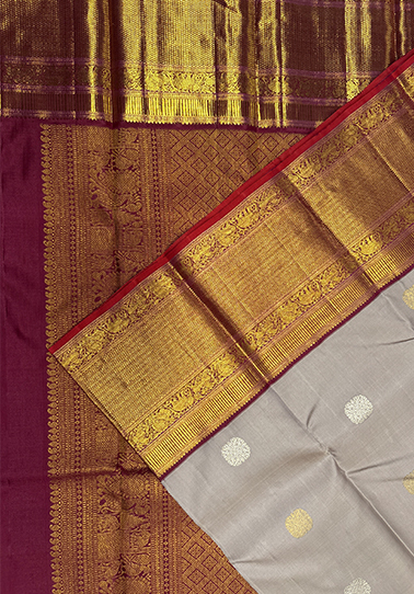 • Weave: Premium pure Kanchipuram handloom with traditional motif detailing • Body Colour: Light mushroom • Design: Silver and golden rudrakshi motifs across the body • Border: Dark maroon with Yaanai, Annapakshi & Yaali motifs • Special Detail: One-side broad border with burnt orange piping • Blouse: Dark maroon plain blouse with matching border • Occasion: Ideal for weddings, festive wear, temple visits, and traditional ceremonies