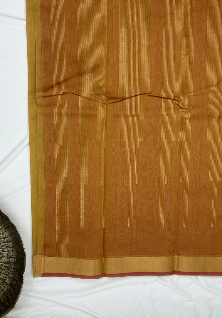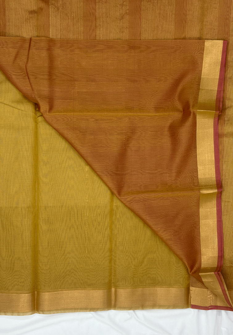 This elegant pure handloom cotton silk saree features a rich mustard yellow body, intricately woven with antique zari and chikoo thread detailing in an all-over design that adds depth, texture, and timeless sophistication. The warm, vibrant tone of the body beautifully enhances the subtle sheen of the antique zari, reflecting the finesse of traditional handloom craftsmanship. The saree is complemented by a self-colour antique zari plain Bavanji border, offering a refined and understated frame that enhances the body without overpowering its intricate weaving. Completing the ensemble is a contrast dual-tone blouse in shades of mustard yellow and pink, thoughtfully designed with a plain border to create a harmonious and polished finish. Soft, breathable, and comfortable to drape, this handloom cotton silk saree is ideal for festive occasions, temple ceremonies, and elegant celebrations. A graceful blend of heritage artistry, subtle luxury, and enduring handloom craftsmanship.