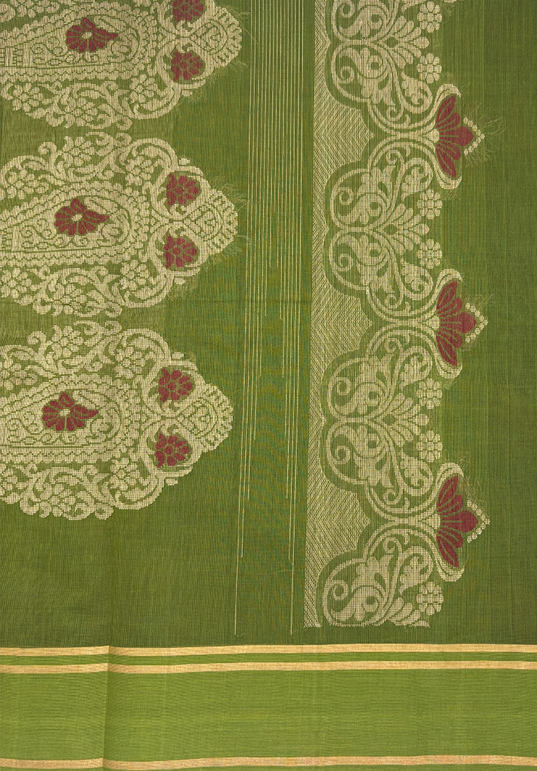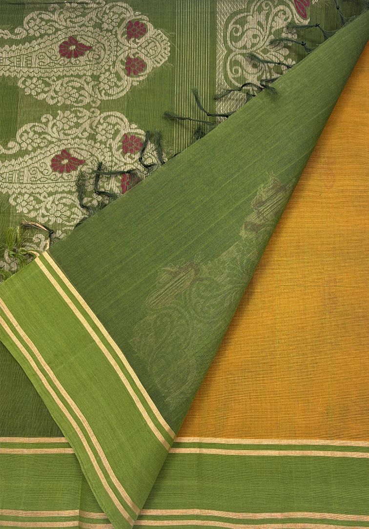 This elegant pure handloom cotton saree features a vibrant mustard yellow body that radiates warmth and timeless charm. The body is beautifully adorned with classic paisley motifs, adding a rich traditional touch and graceful detailing to the overall drape. The saree is complemented by a contrasting olive green border, creating a refined and earthy colour balance that enhances the richness of the mustard hue. Completing the ensemble is a matching contrast olive green blouse, thoughtfully designed to provide a harmonious and polished finish. Soft, breathable, and comfortable for all-day wear, this handloom cotton saree is ideal for office wear, cultural gatherings, and elegant daytime occasions. A perfect blend of heritage motifs, striking colour contrast, and authentic handloom craftsmanship.