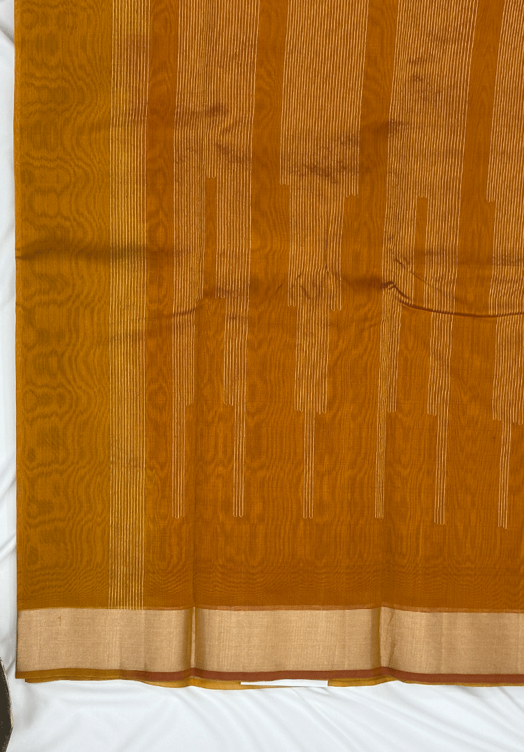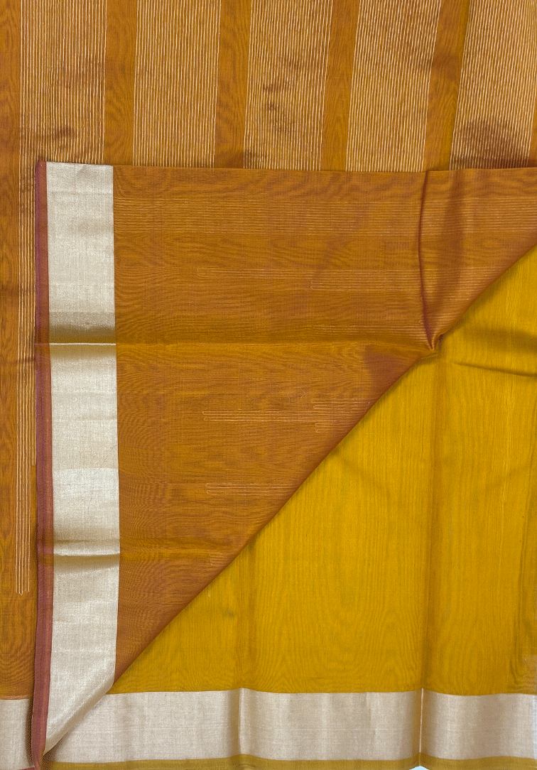 This elegant pure handloom cotton silk saree features a rich mustard yellow body, intricately woven with antique zari and chikoo thread detailing in an all-over design that adds depth, texture, and timeless sophistication. The warm, vibrant tone of the body beautifully enhances the subtle sheen of the antique zari, highlighting the finesse of traditional handloom craftsmanship. The saree is complemented by a self-colour antique zari plain Bavanji border, offering a refined and understated frame that enhances the body without overpowering its intricate weaving. Completing the ensemble is a contrast dual-tone blouse in shades of mustard yellow and pink, thoughtfully designed with a plain border to create a harmonious and polished finish. Soft, breathable, and comfortable to drape, this handloom cotton silk saree is ideal for festive occasions, temple ceremonies, and elegant celebrations. A beautiful blend of heritage artistry, subtle luxury, and enduring handloom craftsmanship.