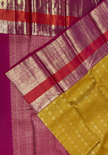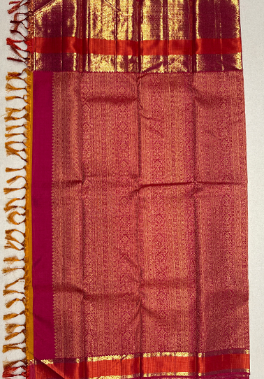 • Weave: Pure Kanchipuram handloom with traditional handwoven design • Body Colour: Mustered yellow with vertical zari lines and motifs • Motifs: Delicate vertical motifs enhancing the body • Border: Reddish magenta and orange thread with zari on one side broad border • Blouse: Reddish magenta with matching one side broad border • Occasion: Perfect for weddings, festive celebrations, temple wear, and special occasions