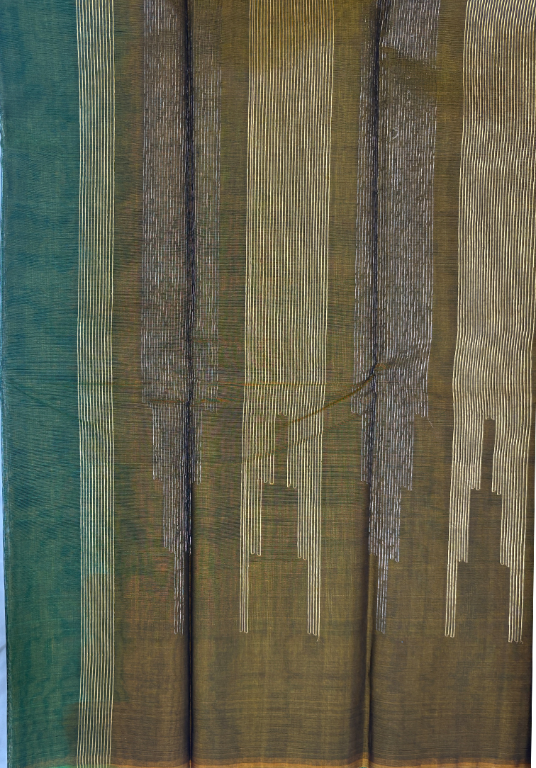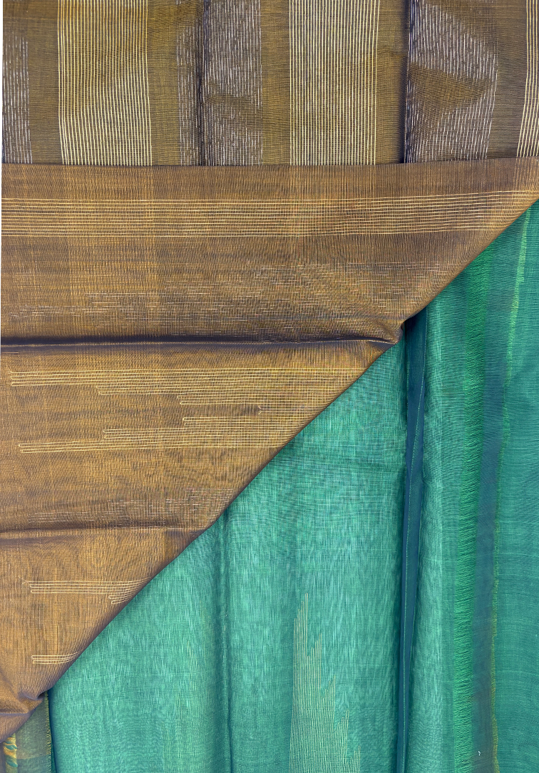 This elegant pure handloom cotton silk saree features a soothing plain muted green body, offering understated sophistication and timeless appeal. The soft, earthy tone of the body creates a graceful canvas that beautifully enhances the ornate border detailing. The saree is accentuated with a statement one-side border, intricately woven with antique and golden zari in a classic temple design running along the entire border. This traditional motif adds architectural elegance, heritage depth, and a refined regal shimmer to the drape. Completing the ensemble is a matching dual-tone blouse in shades of mustard and muted green, thoughtfully designed to provide a warm yet harmonious contrast. Soft, breathable, and comfortable to drape, this handloom cotton silk saree is ideal for festive occasions, temple ceremonies, and elegant celebrations. A graceful blend of subtle colour tones, traditional artistry, and authentic handloom craftsmanship.