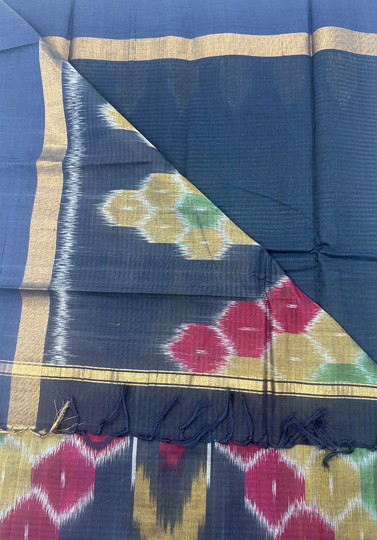 This elegant pure handloom cotton saree features a classic navy blue and blue koorai kattam pattern woven all over the body, offering a timeless and traditional appeal. The saree is finished with a contrast navy blue border, beautifully enhanced with zari and an ikkat-inspired temple design that adds richness and heritage charm. It comes paired with a plain contrast black blouse, finished with a navy blue border for a perfectly coordinated look. Soft, breathable, and handwoven with care, this saree is ideal for everyday wear, office elegance, and traditional occasions.