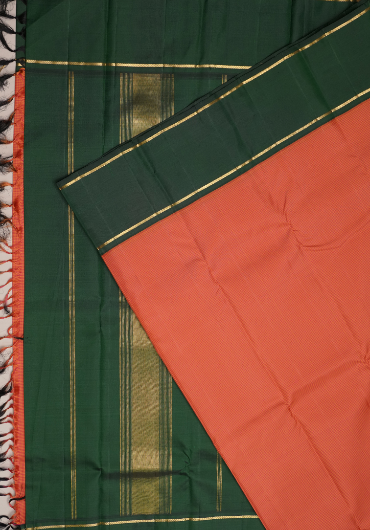 At Looms India, we bring you the heart of Indian weaving with our breathtaking Orange and Pink Dual-Tone Saree. This piece is a true celebration of color, featuring a subtle kasa kasaa kattam pattern that dances across a radiant dual-tone body, shifting gracefully between sunset orange and soft pink. The look is anchored by traditional dark green Korvai borders and a matching dark green pallu and blouse, offering a striking contrast that feels both timeless and fresh. When you choose Looms India, you aren't just buying a garment; you are investing in pure handloom sarees that carry the soul and skill of master artisans. We are proud to be a premier destination for handloom sarees in Kerala, and we strive to make your shopping experience as warm and personal as our weaves. To give you complete peace of mind, we offer a dedicated video call service so you can see the drape and the delicate shimmer of the fabric in real-time. Our team is also here for you around the clock with 24/7 customer service to assist with any questions you may have. At Looms India, we combine the heritage of the loom with the convenience of modern service, ensuring you find a saree you'll cherish for a lifetime.