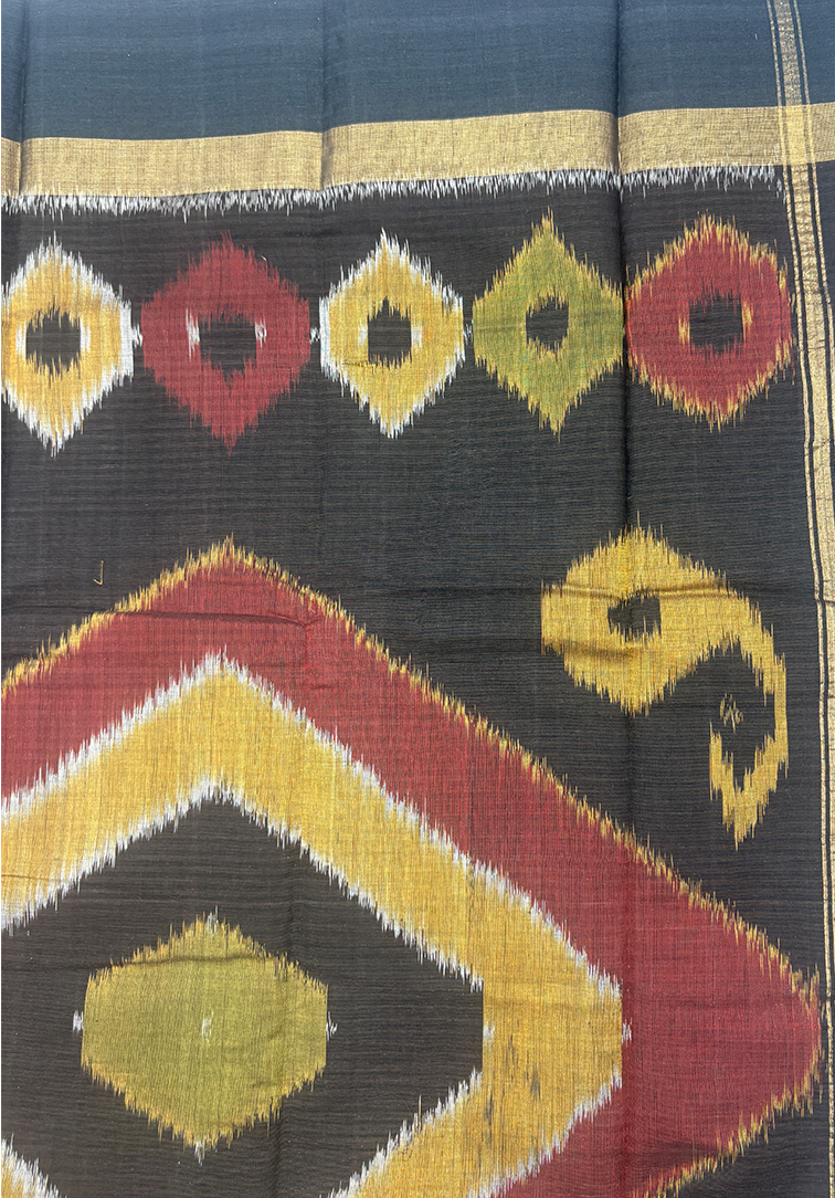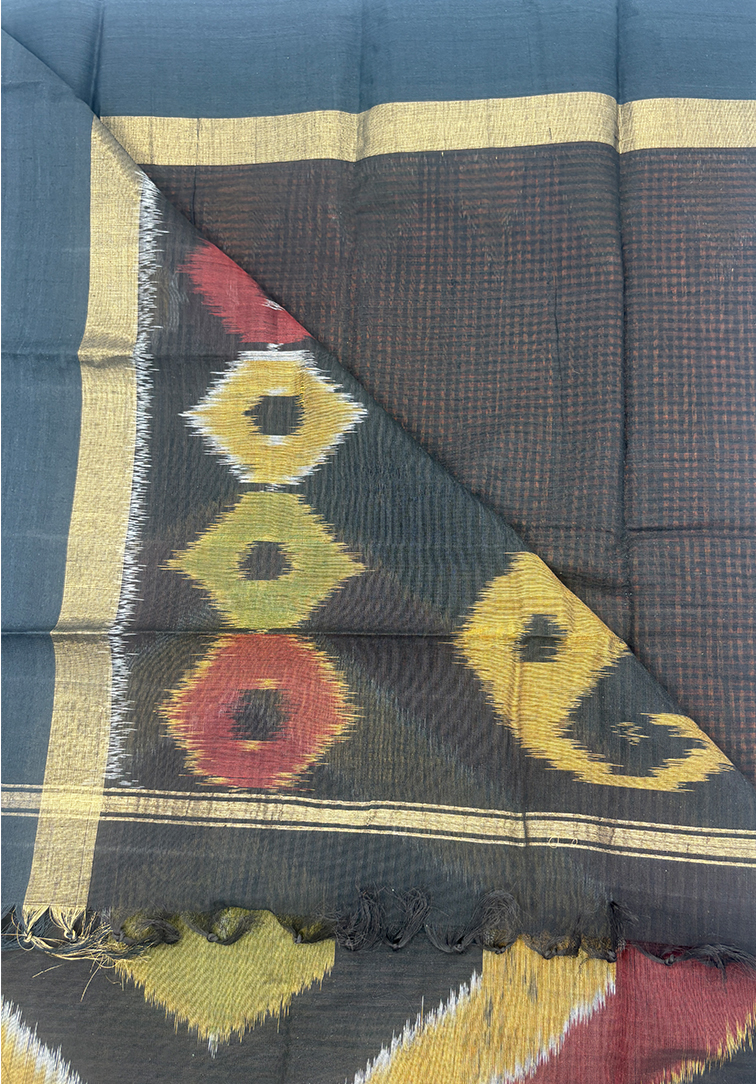 This striking pure handloom cotton saree features a bold orange and black koorai kattam pattern woven all over the body, creating a vibrant and traditional look. The saree is finished with a contrast black border, beautifully enhanced with zari and an ikkat-inspired temple design that adds richness and heritage appeal. It comes paired with a plain contrast black blouse, accented with a subtle brown border for a refined finish. Soft, breathable, and handwoven with care, this saree is perfect for everyday wear, office elegance, and traditional occasions.