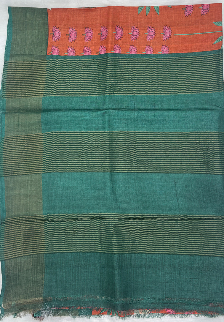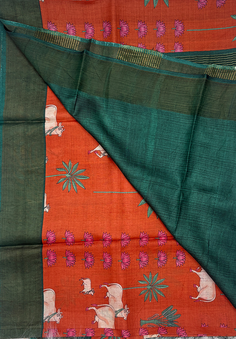 This exquisite pure Tussar silk saree is crafted in a vibrant orange hue, celebrating the raw beauty and natural texture of authentic Tussar silk. The body is adorned all over with hand-painted Pichwai Gaushala artwork, inspired by traditional temple paintings and pastoral motifs, making each saree a unique piece of wearable art. The saree is complemented by a contrast dark green tissue border, adding depth and a soft metallic sheen that beautifully frames the artistic body. The border enhances the richness of the hand painting while maintaining a refined, traditional aesthetic. Paired with a plain dark green blouse finished with a tissue border, the ensemble remains balanced and elegant, allowing the intricate hand-painted details to take centre stage. Ideal for festive occasions, temple visits, cultural gatherings, and art-inspired celebrations, this pure Tussar silk saree is a timeless expression of heritage, craftsmanship, and hand-painted luxury.