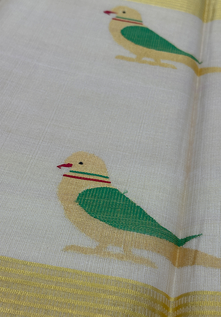 PURE UNAKUPAVU BALARAMAPURAM, KERALA HANDLOOM KASAVU SAREE Pure handloom Kasavu saree featuring a classic off-white body with polka dots woven all over, creating a soft and elegant texture. The pallu is beautifully highlighted with a traditional parrot motif, adding a vibrant and charming focal detail. Finished with a rich gold kasavu border, this saree reflects authentic Kerala handloom craftsmanship and is perfect for festive occasions, cultural celebrations, and graceful traditional wear.