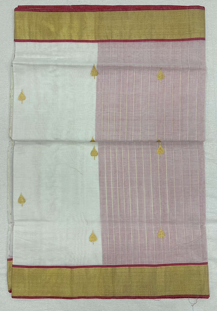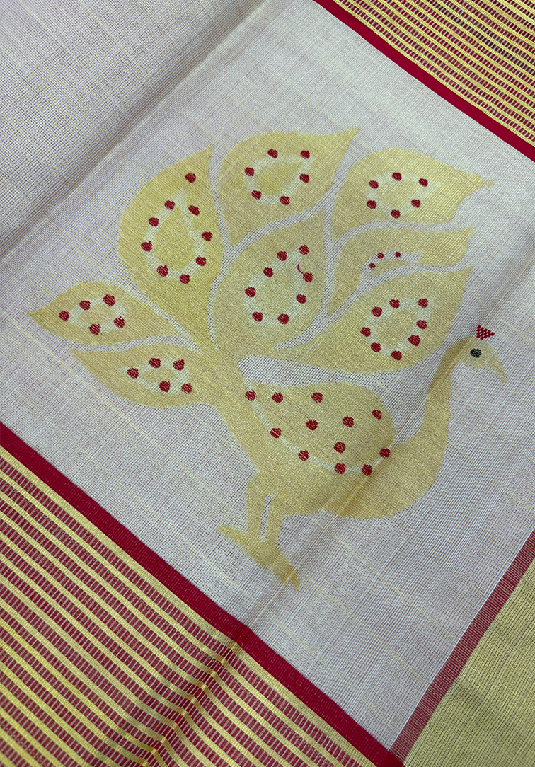 PURE UNAKUPAVU BALARAMAPURAM, KERALA HANDLOOM KASAVU SAREE Pure handloom cotton Kasavu saree in a classic off-white shade, featuring gold leaf motifs woven all over the body for a rich and elegant texture. The pallu is adorned with a grand peacock motif highlighted in red, creating a striking and regal focal point. Finished with a traditional gold zari kasavu border, this saree showcases exquisite Kerala handloom craftsmanship and is ideal for festive occasions, weddings, and special traditional events.